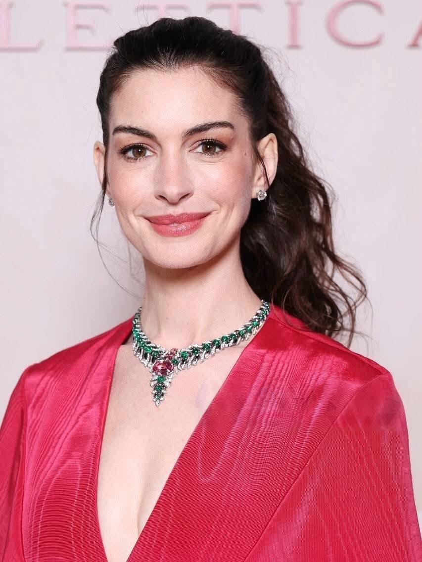 اختارت Anne Hathaway فستاناً أحمر كرزيّاً من Valentino بقصّة أميريّة كلاسيكيّة، تميّز بتنّورة منفوخة وأكمام واسعة وياقة عميقة. اكتملت الإطلالة بمجوهرات فاخرة من BVLGARI مرصّعة بالألماس والجمشت والزمرّد، لتخلق صورة تجمع بين الرقيّ الكلاسيكي والهيبة المعاصرة.