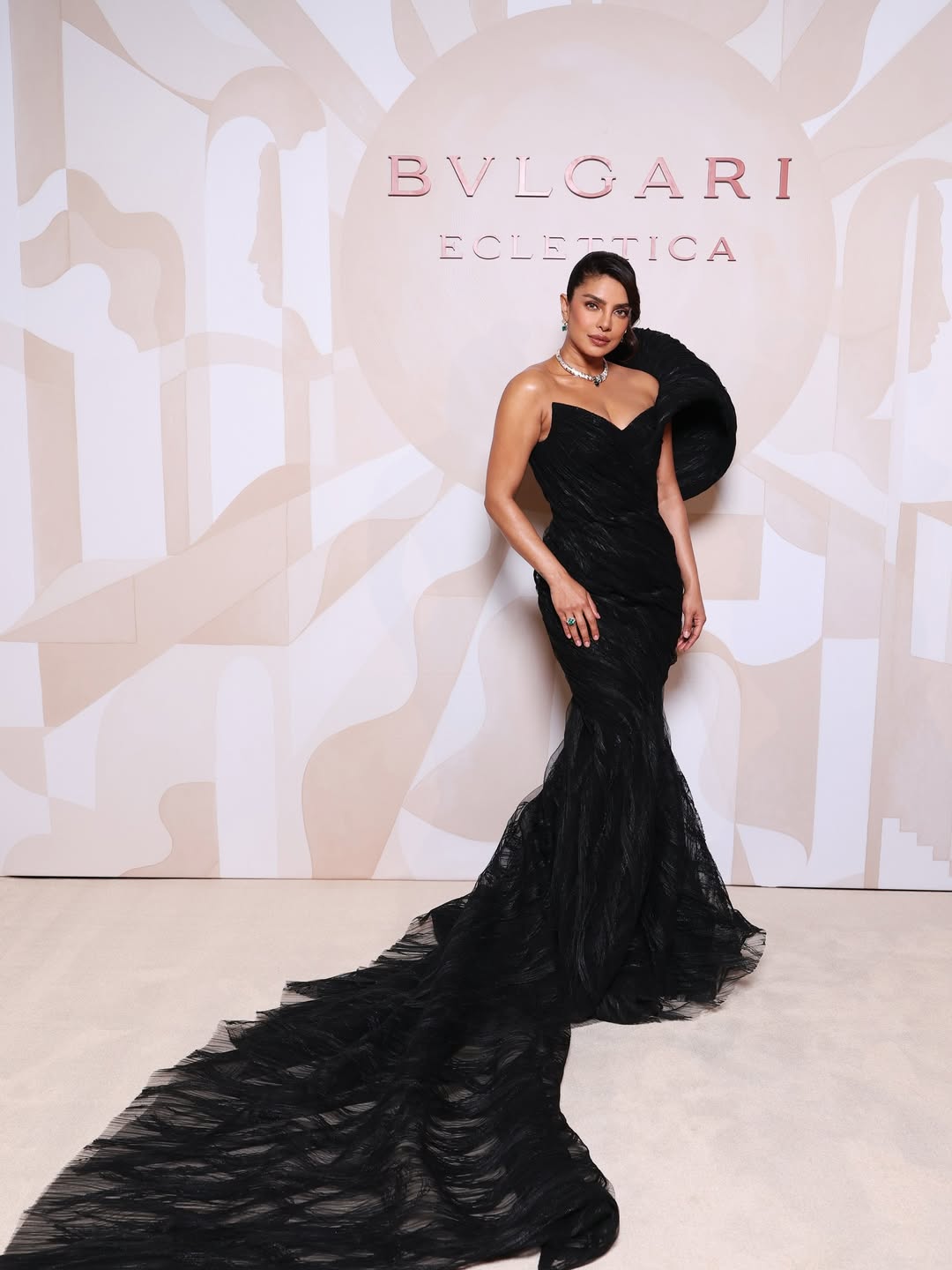 بفستان كوتور أسود من توقيع Said Kobaisi، أطلت Priyanka Chopra بإطلالة نحتيّة دراميّة ذات كتف واحدة وقصّة حورية البحر. المجوهرات الزمرديّة من BVLGARI أضفت بريقاً ملكيّاً، فيما عزّز اللون الأسود حضور الأحجار الثمينة، في تناغم بين القوّة والأنوثة.