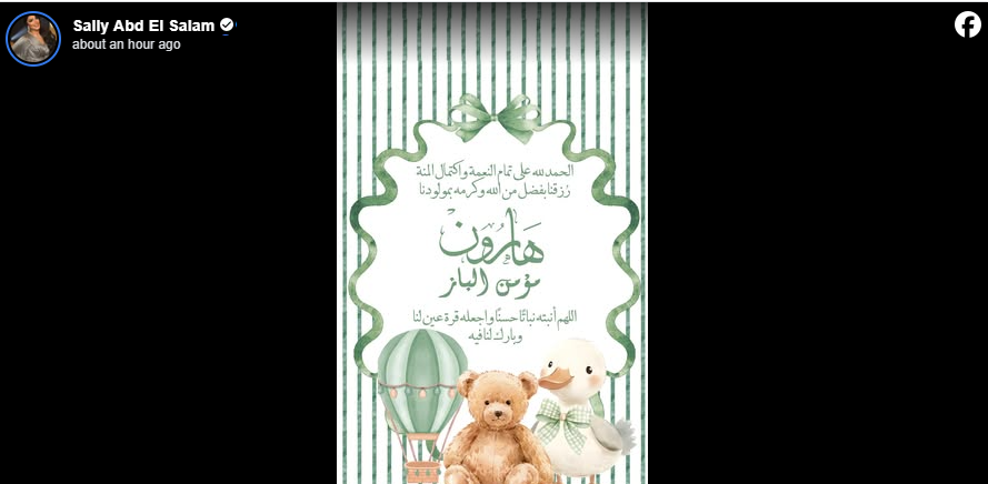 بكلمات تملؤها الدموع والامتنان علقت سالي عبد السلام على الحدث قائلة إن رزقها بـ "هارون مؤمن الباز" هو فضل من الله وحده دون حول منها ولا قوة وعبّرت عن سعادتها بلقب "أم" لأول مرة بقولها "الحمد لله الذي تتم بنعمته الصالحات.. الجنة بقت تحت رجلي"