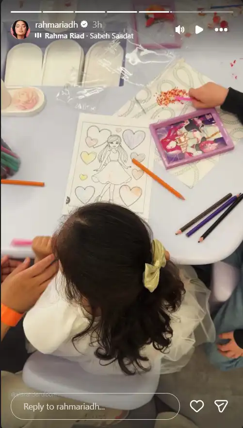 من جهتها، نشرت رحمة رياض عبر خاصية "الستوري" لقطات من الاحتفال، ظهرت فيها الطفلة عالية وهي تلوّن وترسم على الطاولة في مشهد عفوي يعكس براءتها، بينما شاركها والدها الأجواء المرحة بطريقة لاقت إعجاب المتابعين.