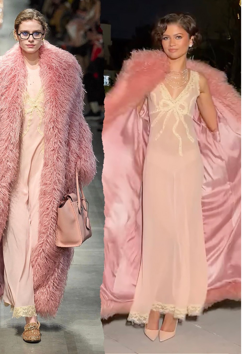 بعيداً عن النعومة المعتادة، اختارت زيندايا فستاناً باللون الوردي الشاحب (Blush) من دار Matières Fécales. تميز هذا التصميم بجرأته، حيث اعتمد على الأقمشة المنسلة والتفاصيل الممزقة (Frayed) والورود القماشية الموزعة بعشوائية فنية، ليمنحنا إطلالة تجمع بين الأنوثة والرومانسية "الدرامية" التي تناسب أجواء فيلمها.