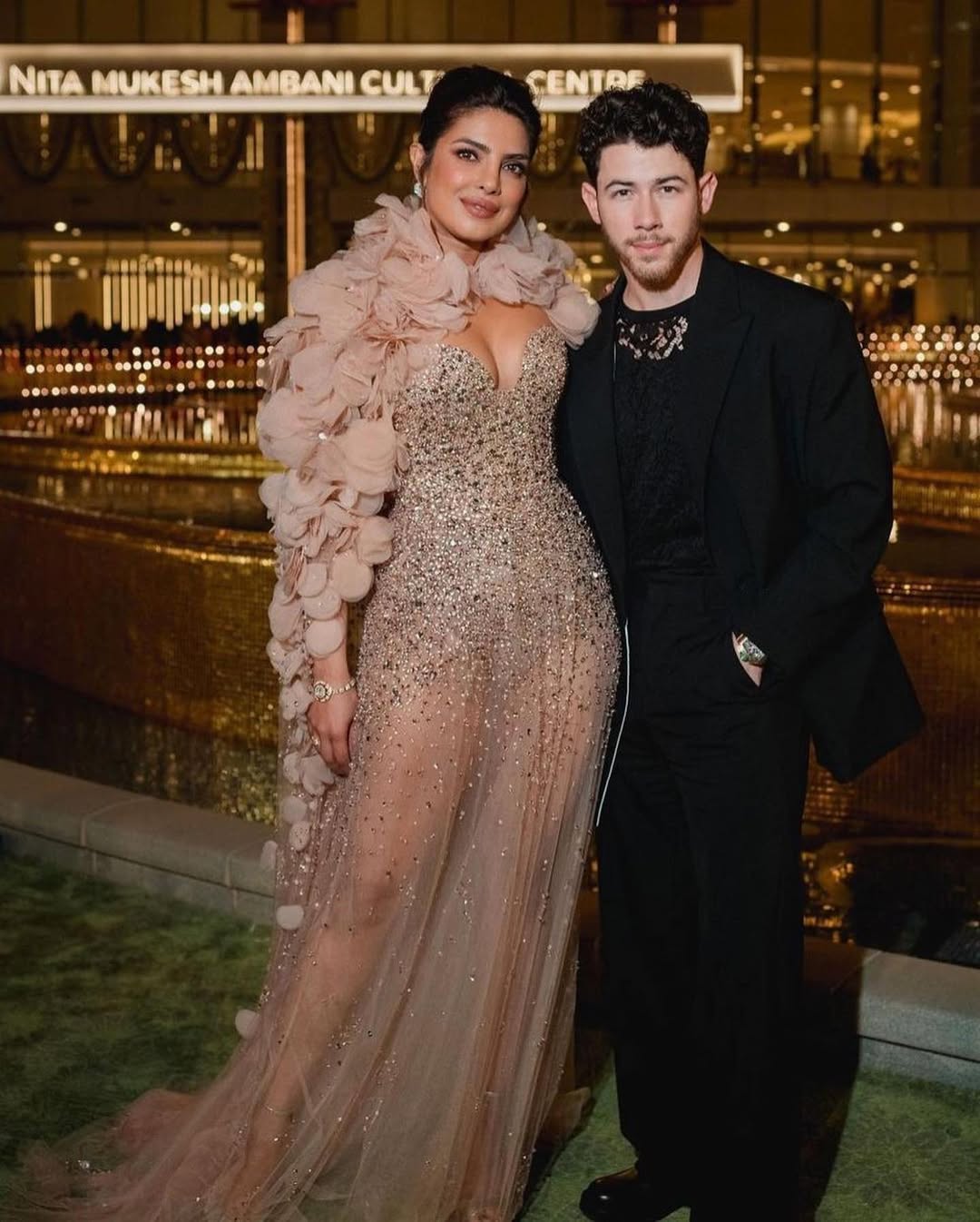 وكعادتها، نسّقت بريانكا إطلالتها مع عقد مرصّع من بولغري وأقراط وخواتم متناغمة، فيما اعتمدت تسريحة الكعكة المرفوعة مع خصلة أمامية مموجة، ما منح الإطلالة لمسة كلاسيكية أنيقة.
