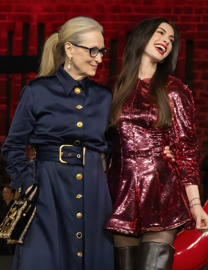فـ آن هاثاواي ظهرت بطاقة أكثر حداثة وانسيابية، تعكس امرأة تطورت وتبدلت وخرجت من قالبها القديم، فيما حافظت ميريل ستريب على صورة السلطة الهادئة التي لا تحتاج إلى إثبات.