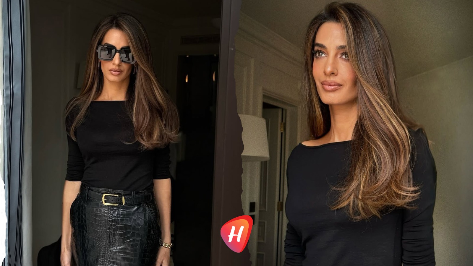 اختارت أمل لوكاً أسود بالكامل، لكنه لم يكن تقليدياً أبداً، بل حمل الكثير من الفخامة الهادئة. فقد نسّقت تنورة ميدي جلدية بنقشة التمساح من مجموعة إيلي صعب لخريف وشتاء 2026-2027مع توب أسود ضيق بياقة bateau، في توليفة أبرزت قوامها بأسلوب أنثوي راقٍ، بينما أضاف الحزام تحديداً أنيقاً للخصر، واكتملت الإطلالة بنظارات شمسية كبيرة وسوار ذهبي منحها لمسة مترفة من دون مبالغة.