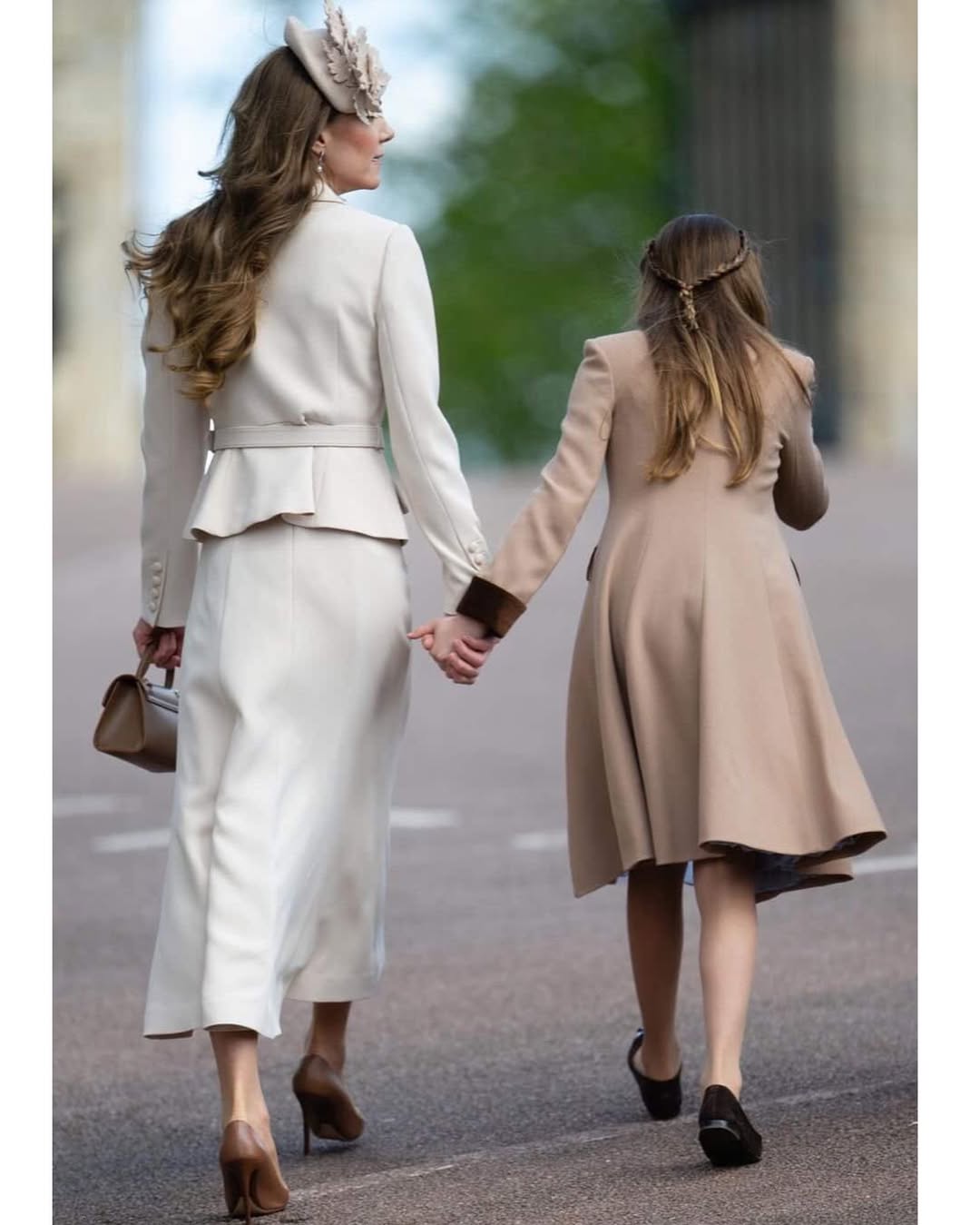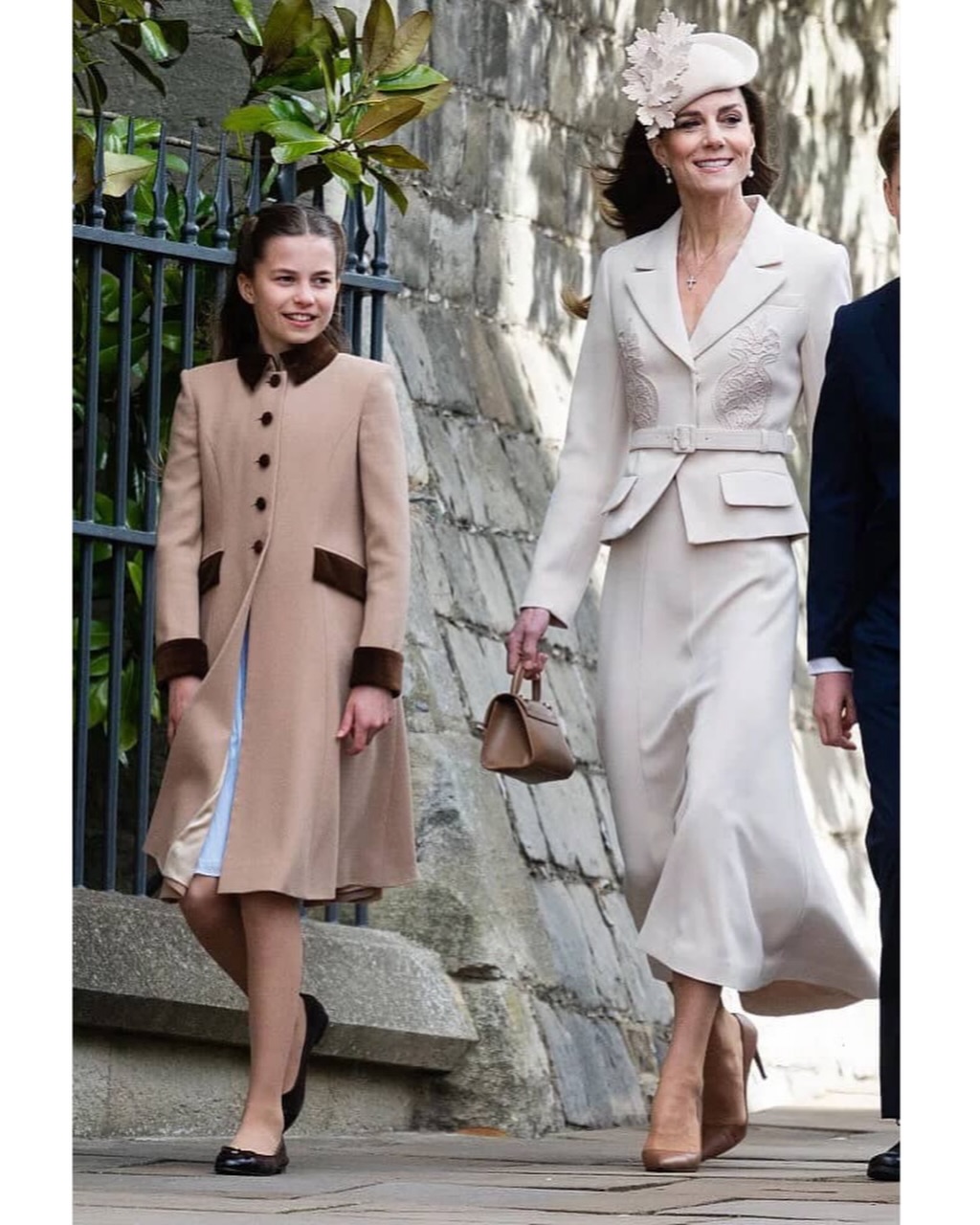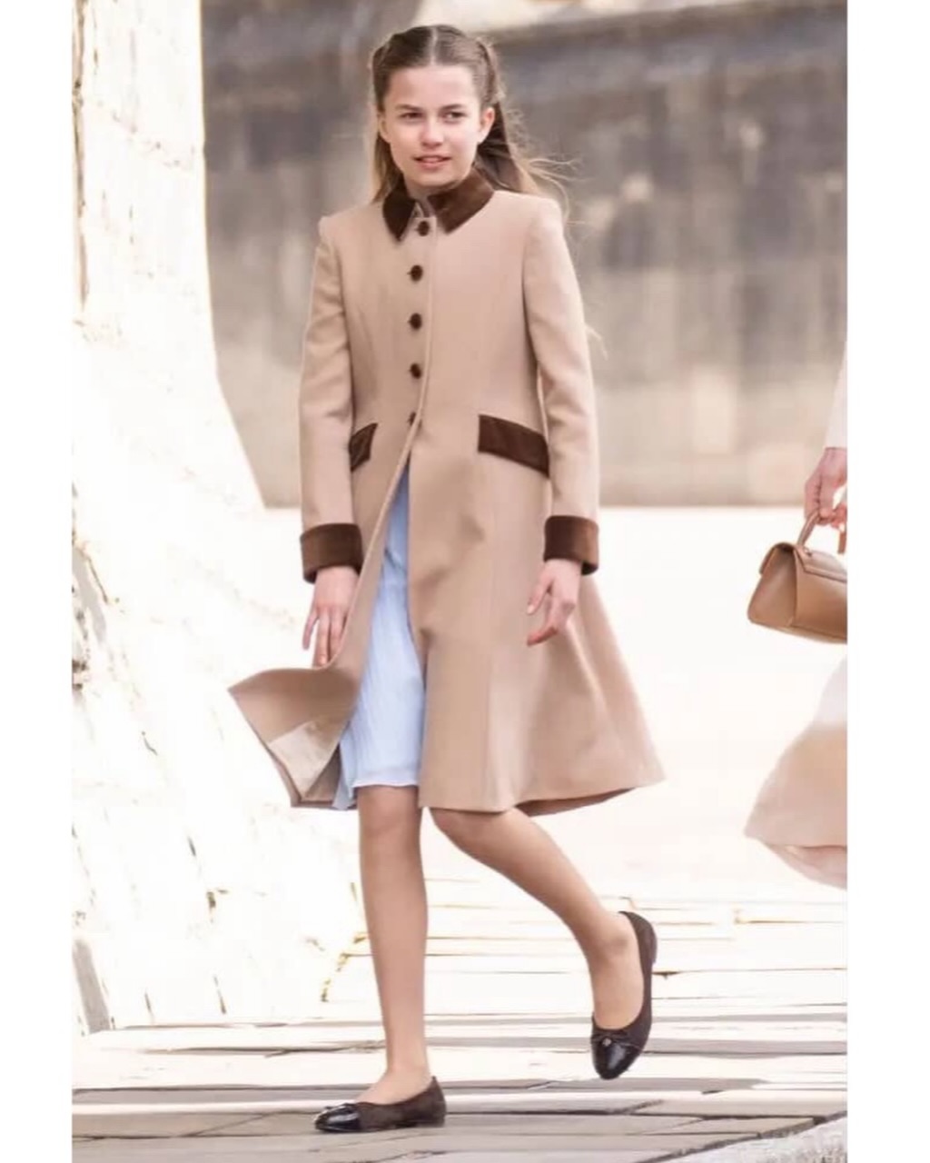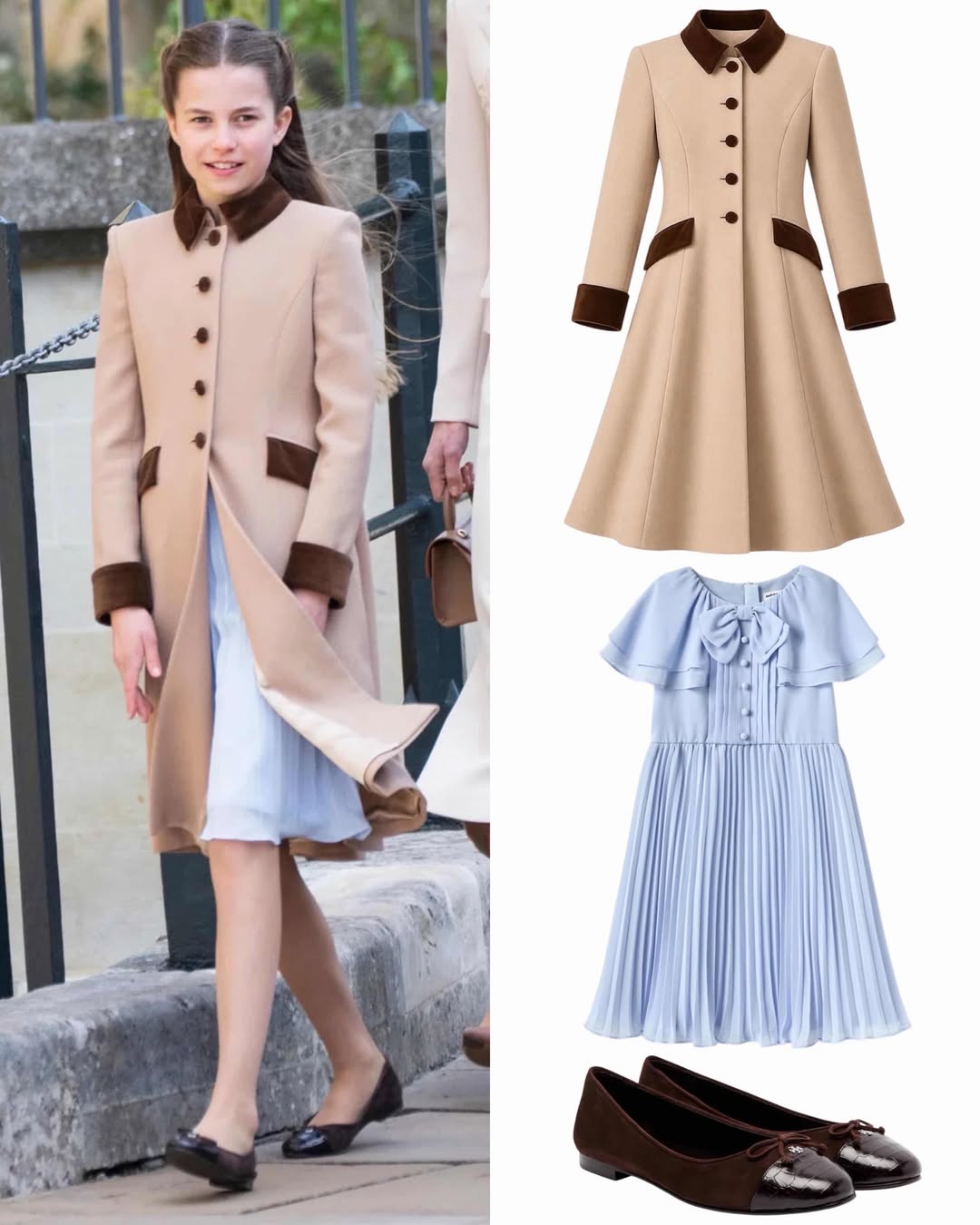 اختارت شارلوت ارتداء معطف من تصميمcatherine walker London ، وهو نفس الطراز الذي تعتمد عليه والدتها كيت ميدلتون في المناسبات الملكية الكبرى، ما يعكس استمرارية أسلوب العائلة الملكية في الأناقة. تحت المعطف، ارتدت فستان من الشيفون المطرز @mrselfportrait باللون الأزرق (€250)، وأضافت لمسة نهائية من الرقة مع حذاء باليه Cap Toe من جلد التمساح @toryburch (€345).