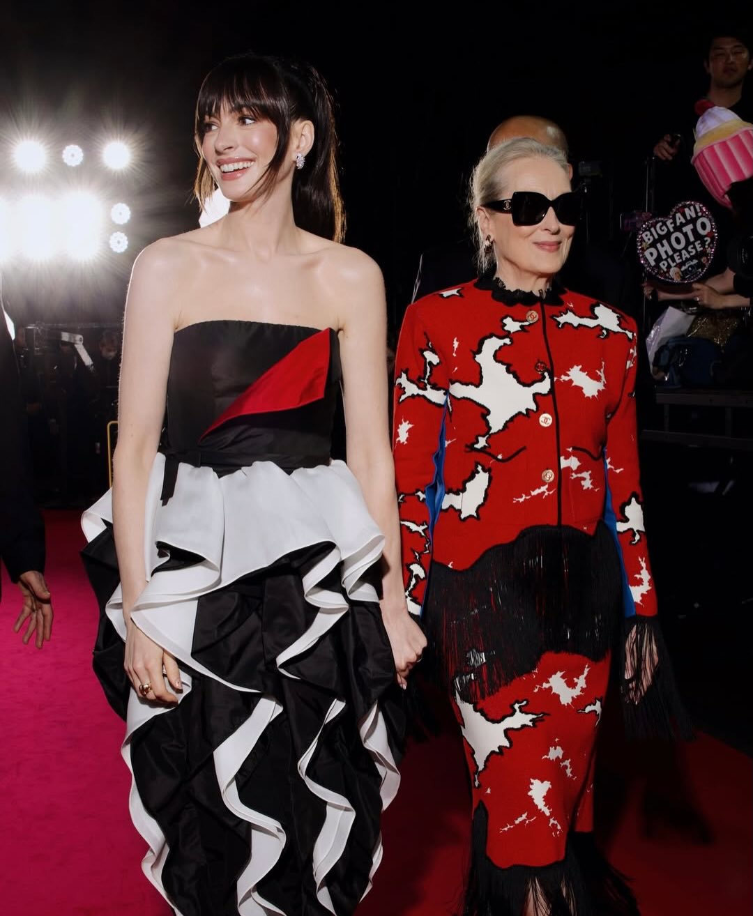 أما ميريل ستريب، فاختارت أن تظهر بأسلوب مختلف تماماً، من خلال إطلالة حمراء من Chanel من مجموعة Métiers d’Art، تميّزت بتفاصيل الشراريب ولمسة لافتة تجمع بين الفخامة والجرأة.