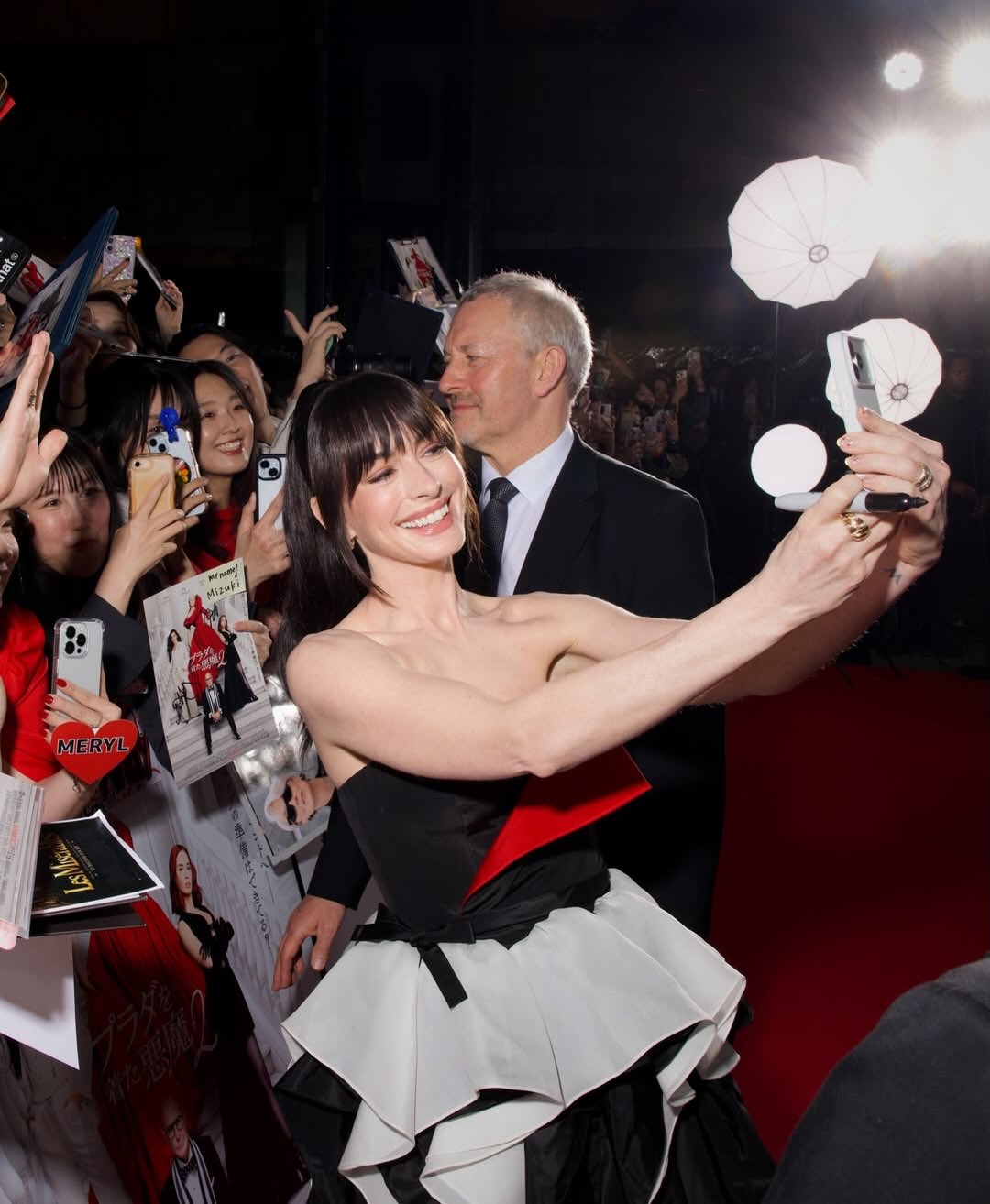 إطلالتها بدت متناغمة تماماً مع شخصيتها في الفيلم، ومع أجواء Runway التي صنعت جزءاً كبيراً من ذاكرة الجمهور، وكأن هاثاواي تعيد إحياء تلك المرحلة لكن بثقة ناضجة وأناقة أكثر هدوءاً ورقياً.
