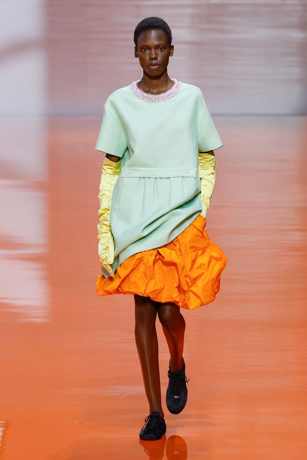 في بعض العروض، حضرت القفازات الطويلة بألوان صادمة، تُقابل فساتين السهرة أو الإطلالات المفصّلة بشكل متناقض ومقصود، وكأن اليدين خرجتا من سياق منزلي أو عملي لتدخلا فجأة عالم الفخامة.