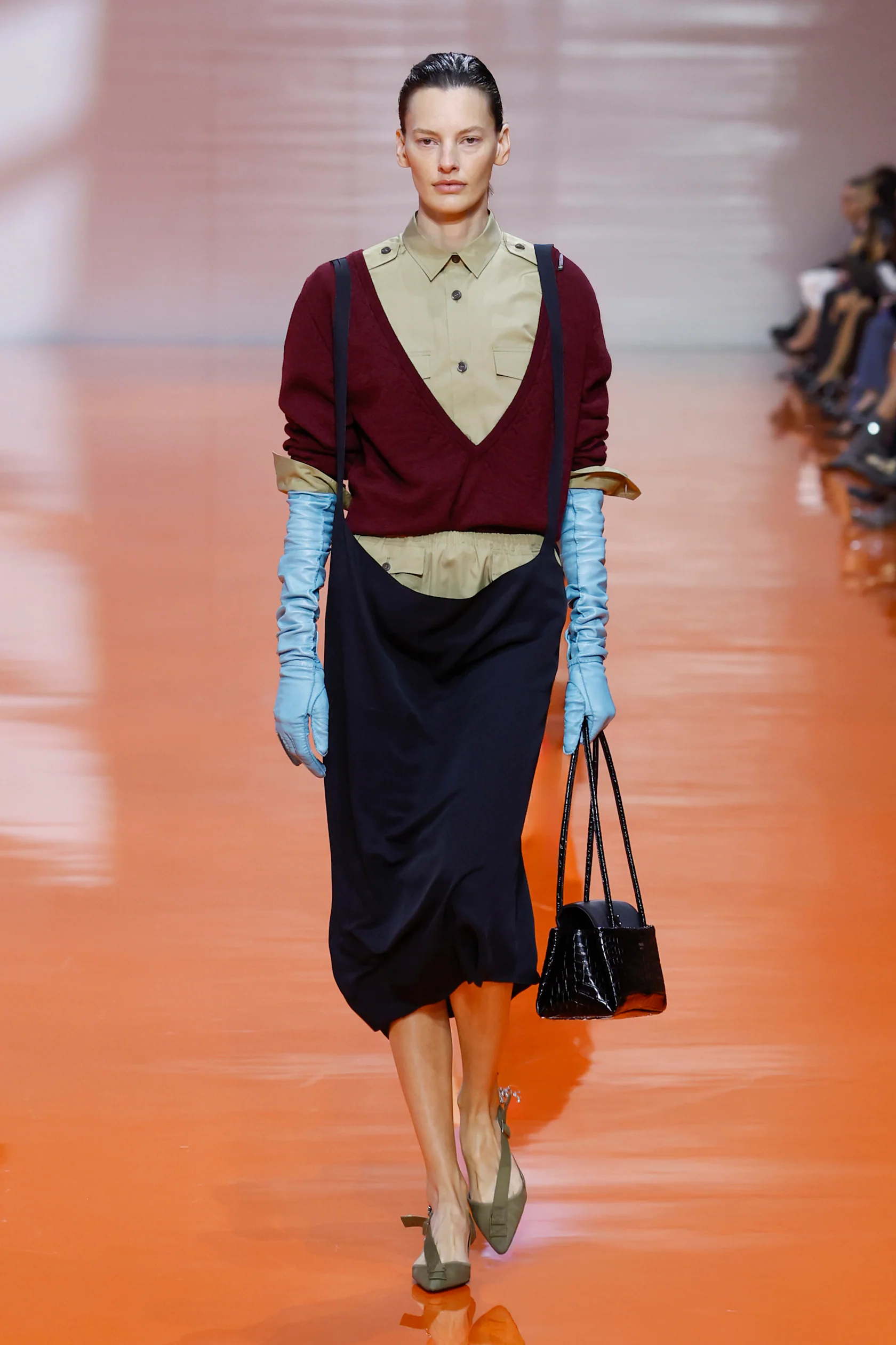 ألوان حادة، خامات توحي بالمطاط أو البلاستيك، وطول درامي يجعل اليدين تبدوان كجزء من زيّ عملي أعيدت صياغته في مختبر الأزياء.