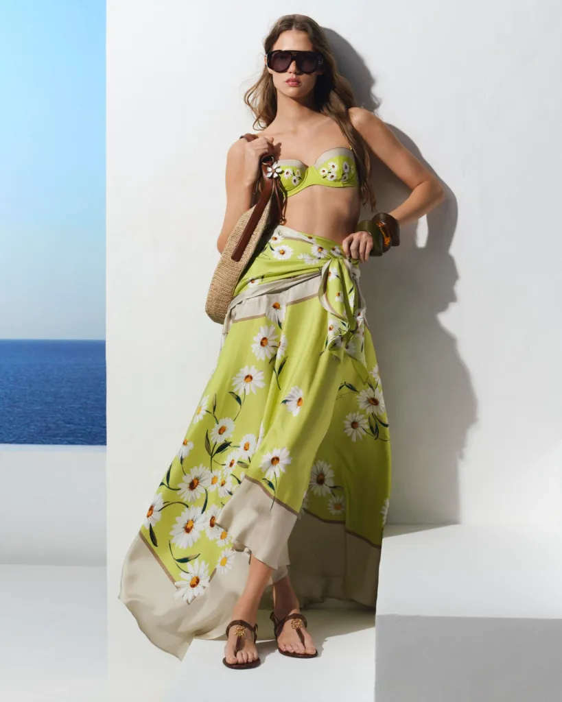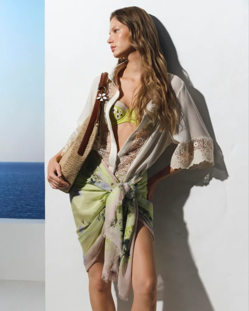 لم تخلُ المجموعة من اللمسات الحرفية اليدوية؛ حيث أضفت تفاصيل الكروشيه" المنسوجة بعناية طابعاً نوستالجياً يعيدنا إلى بساطة الماضي الجميل. ومع تنسيقها مع صنادل بسيطة وحقيبة الـ "Riviera Tote" المصنوعة من قماش الرافيا، اكتملت صورة المرأة المسافرة التي تبحث عن الأناقة في خامات الطبيعة.