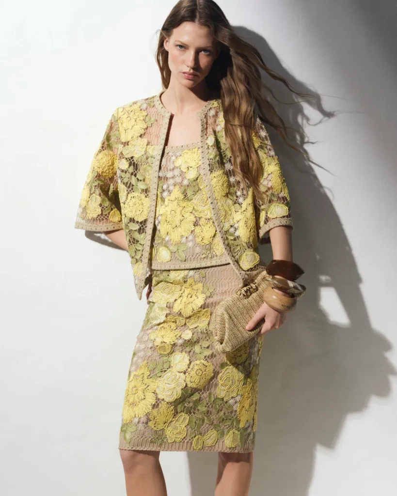 برزت زهرة الأقحوان (Daisy) كبطل خفي في هذه المجموعة، لتمثل التوازن الدقيق بين النعومة والرقيّ. رأيناها تارةً تزين أحزمة فساتين "الماكسي" الانسيابية، وتارةً أخرى تتفتح برقة فوق "التيشرتات" القطنية الفاخرة، لتؤكد أن التفاصيل الصغيرة هي التي تصنع الفارق في فلسفة إيلي صعب الإبداعية.