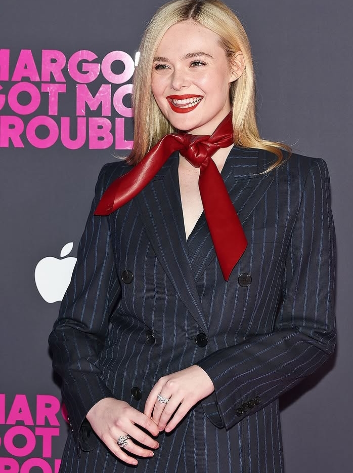 لكن أكثر ما جعل إطلالة آيل فانينغ تخرج من إطار البدلة الكلاسيكية، كان ذلك الوشاح الجلدي الأحمر البرغندي المربوط حول الرقبة.
