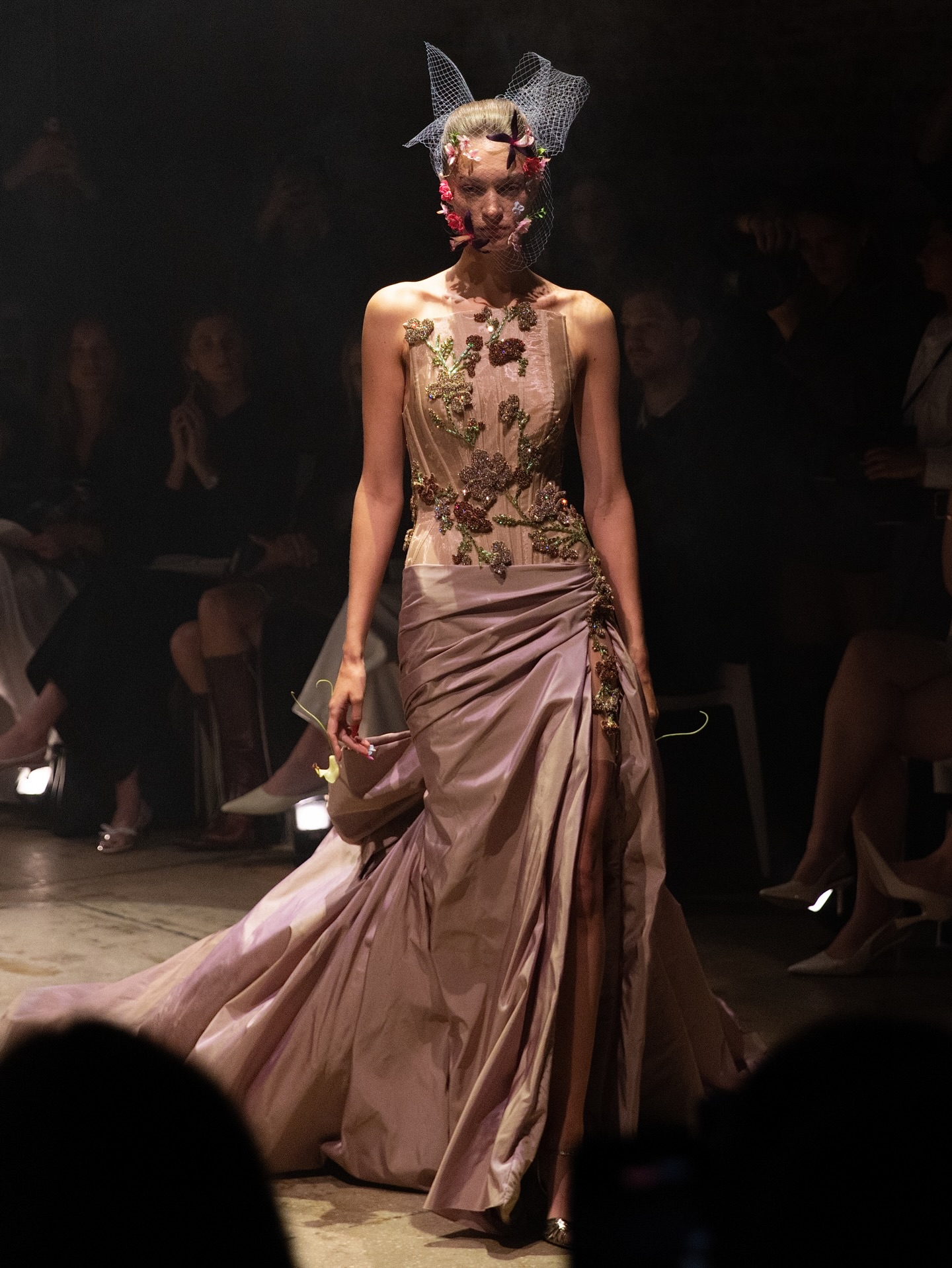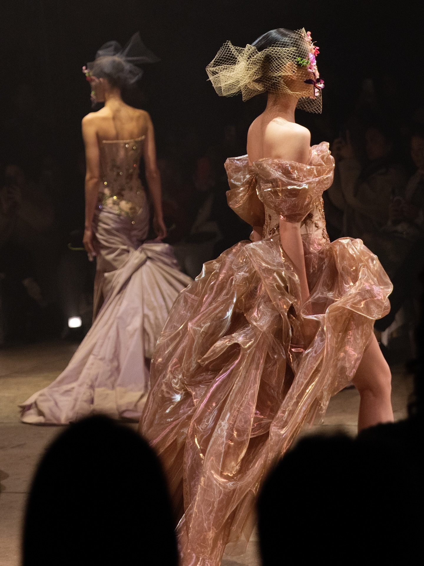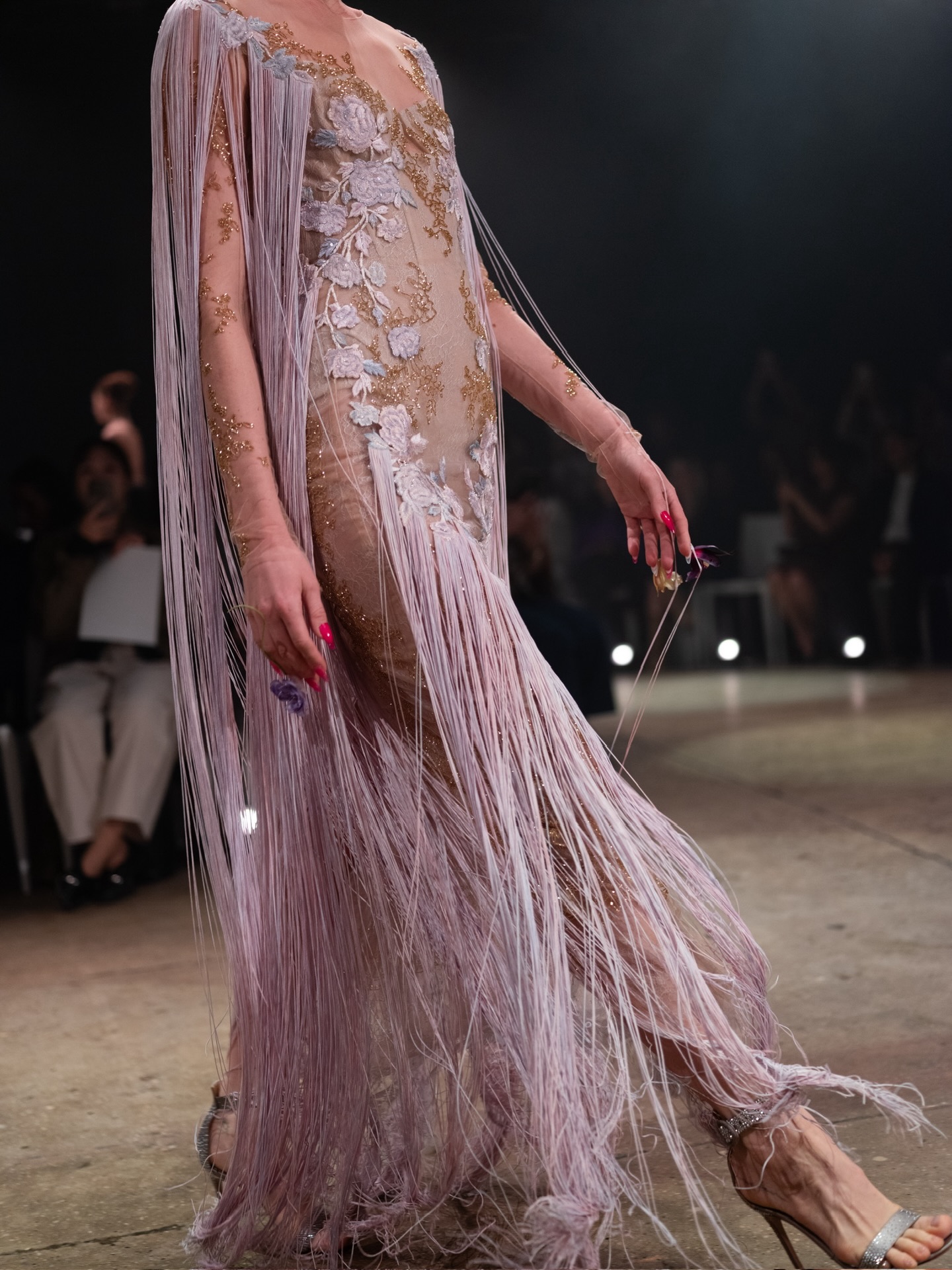 اعتمدت المجموعة على ما يسمى "العمارة الحسية"، حيث رأينا فساتين بخصر منخفض (Drop Waist) تبرز ركازة القوام، مع أكمام منفصلة وأوشحة حريرية طويلة تتدلى من الرقبة لتضيف لمسة من الملوكية العصرية.