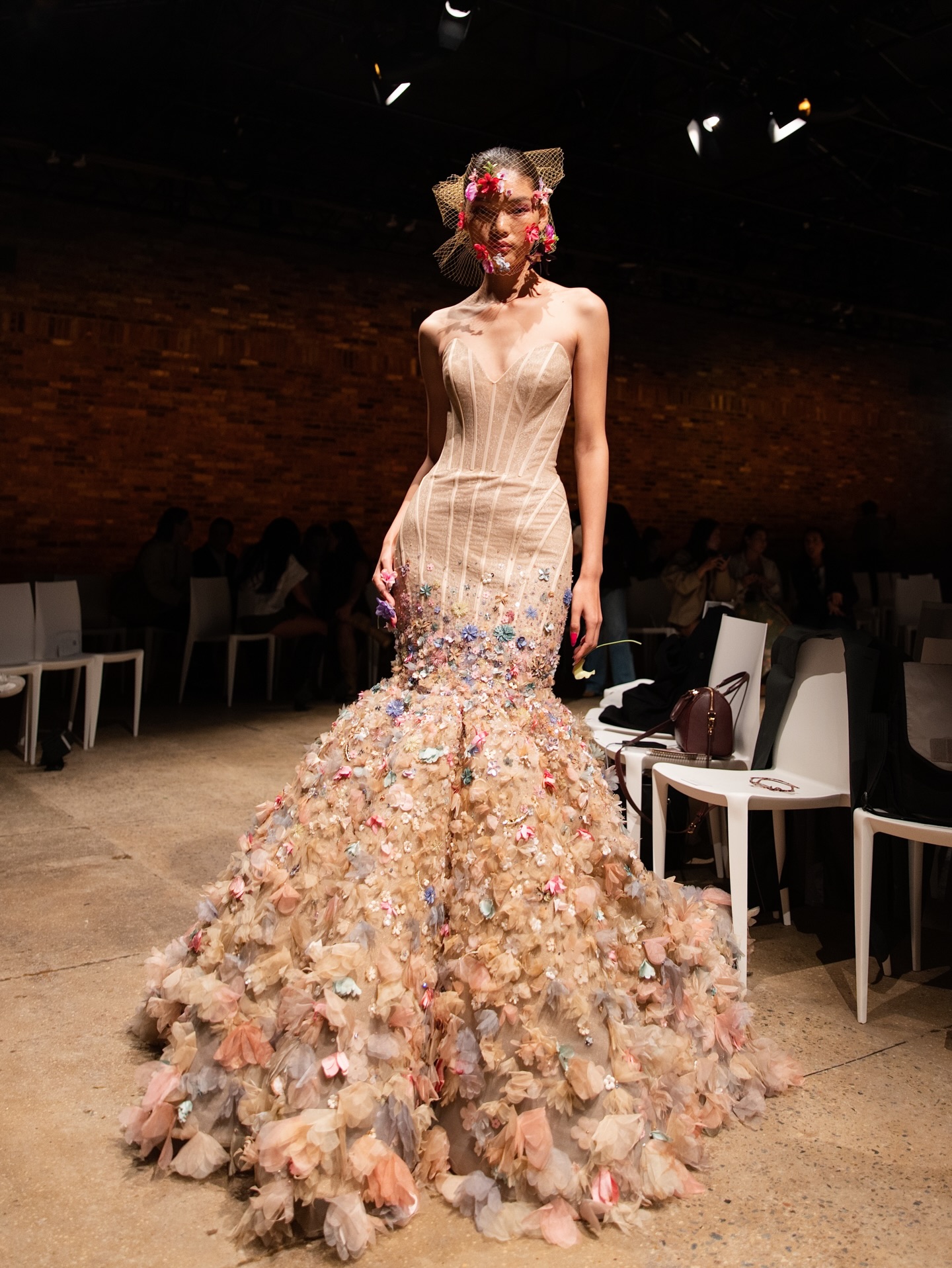 أثواب ايناس ليست عادية بل اثواب أحلام ملفتة لديها تلك القدرة الفائقة على "نحت" الفستان. إذ برز في العرض ثوب أيقوني بدا وكأنه حديقة عائمة، حيث ازدان بمئات الورود الكبيرة ثلاثية الأبعاد (3D) المشغولة يدوياً من الأورجانزا والحرير المصقول. هذه الورود لم تكن مجرد زينة، بل كانت جزءاً من هيكل الفستان، تمنحه حجماً دراماتيكياً وحركة انسيابية تجعل العروس تبدو وكأنها تمشي وسط بتلات الزهور.