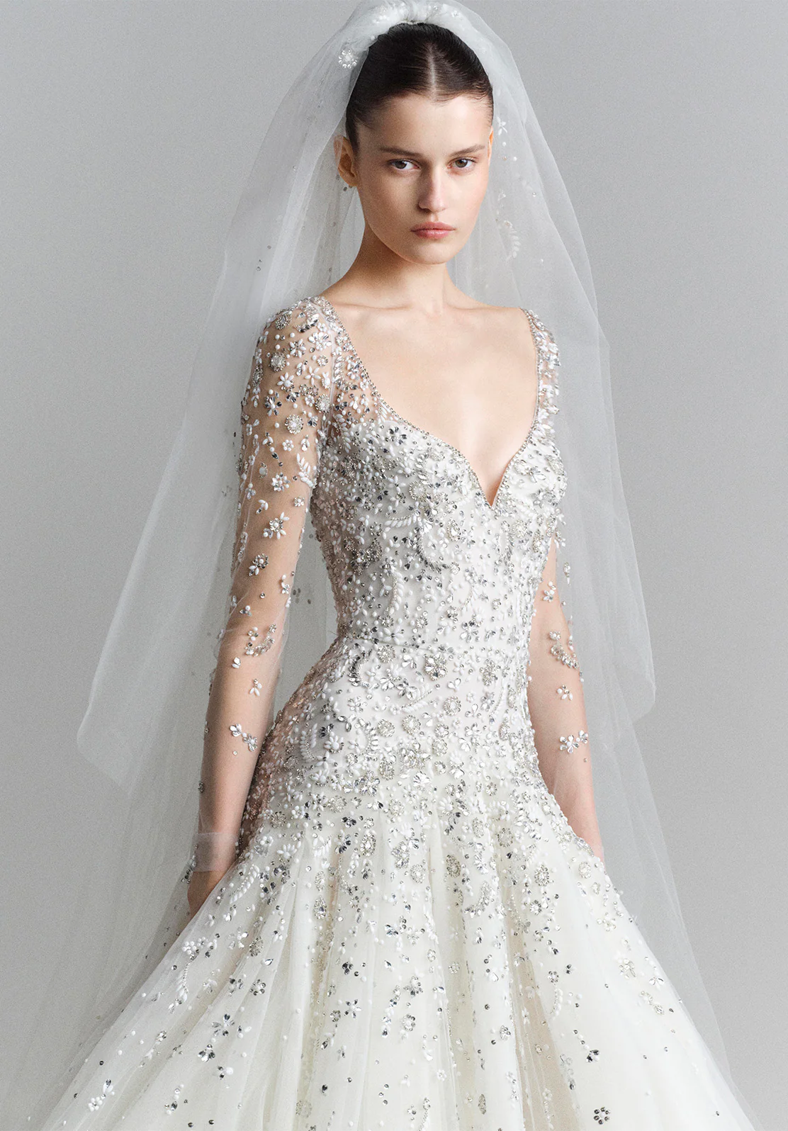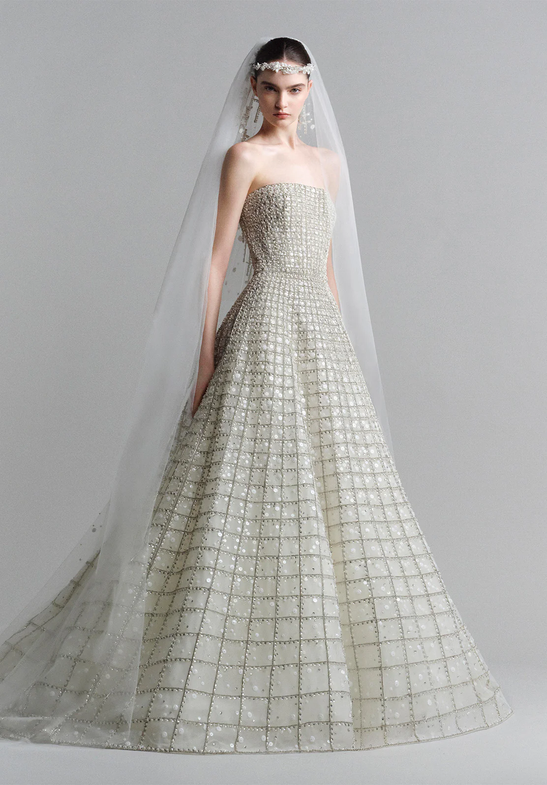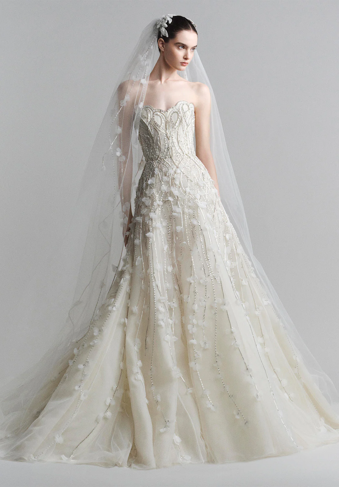 تطريزات الحرير والتول تلتقط الضوء تحت حجاب مرصّع ببتلات حالمة.