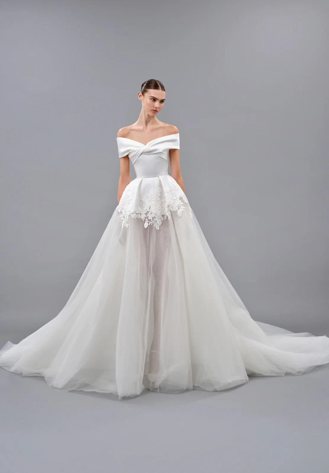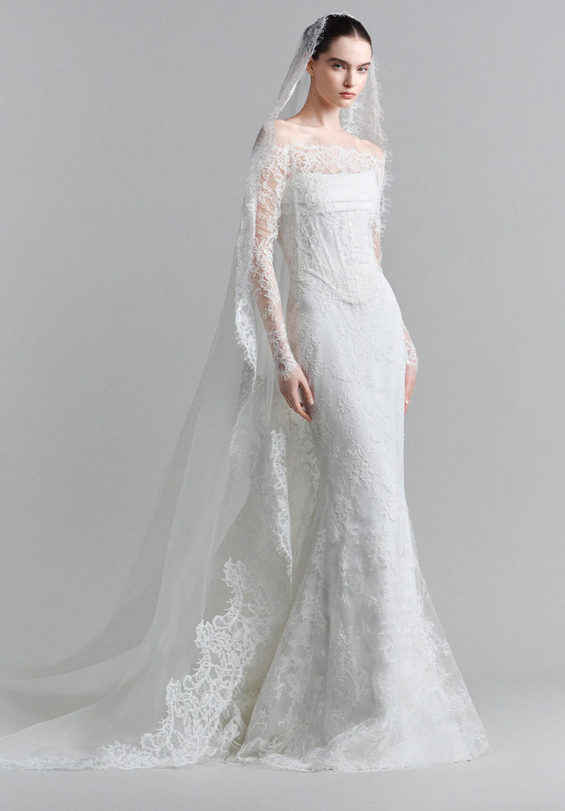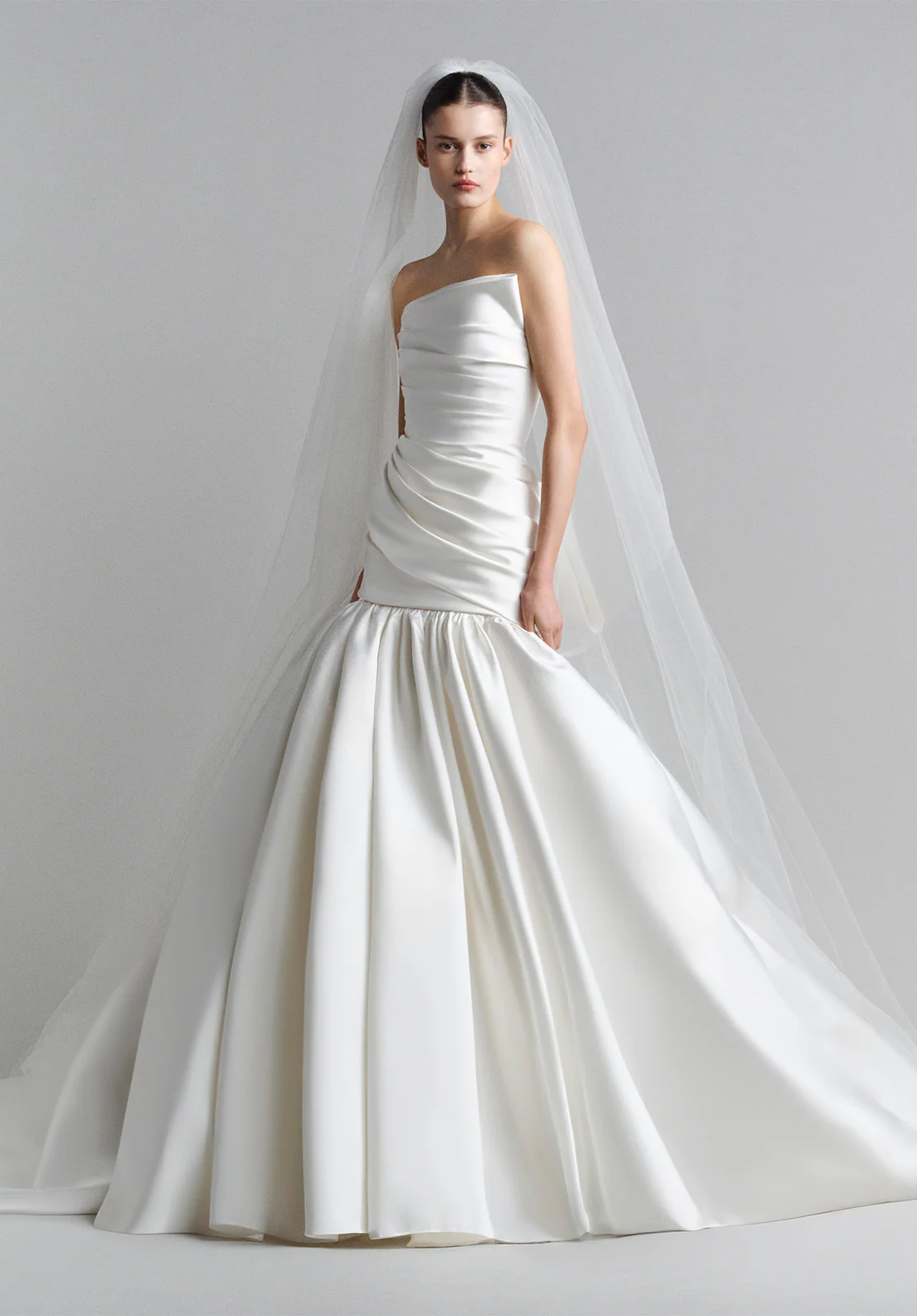 تطريزات الحرير والتول تلتقط الضوء تحت حجاب مرصّع ببتلات حالمة.