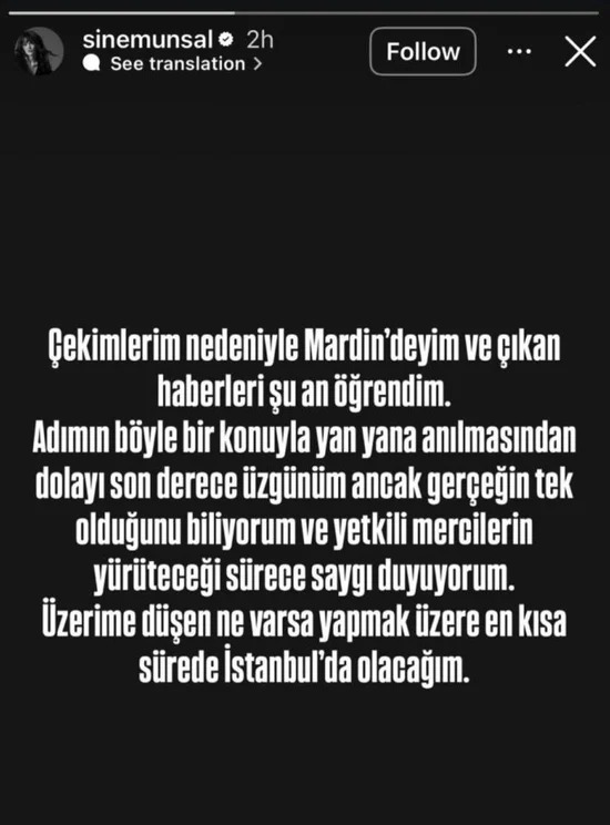 في أول تعليق لها، نفت سينام أونسال أي علاقة لها بالقضية، مؤكدة أنها كانت متواجدة في مدينة ماردين خلال الفترة الماضية بسبب تصوير عمل فني.