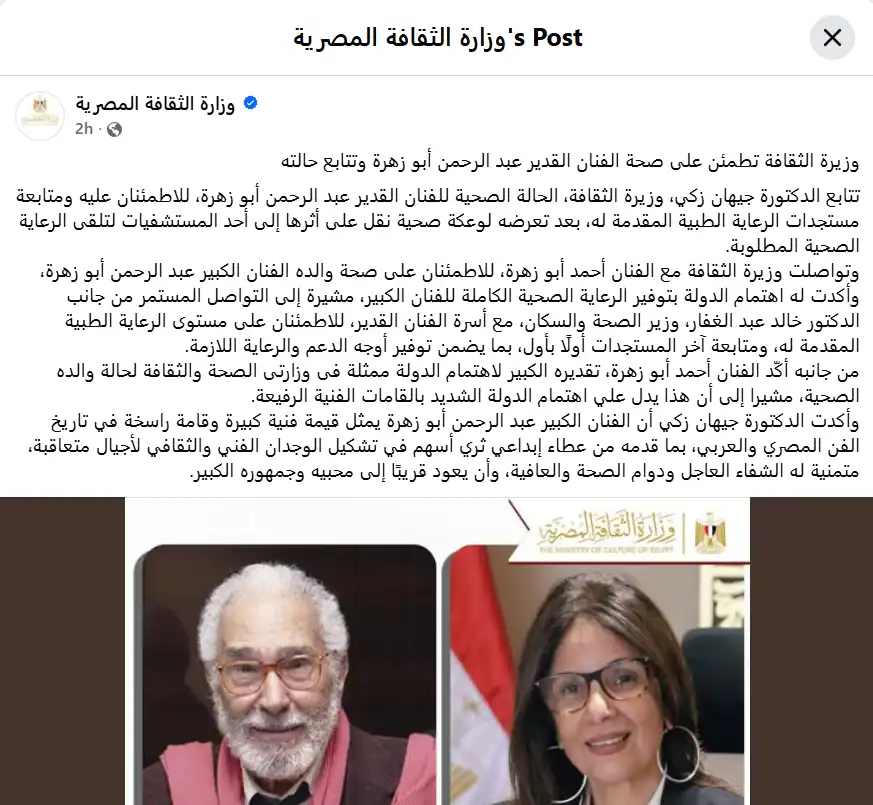 أصدرت وزارة الثقافة المصرية بياناً رسمياً أكدت فيه متابعة الدكتورة جيهان زكي، وزيرة الثقافة، للحالة الصحية للفنان القدير بشكل دوري. وأوضح البيان النقاط التالية: