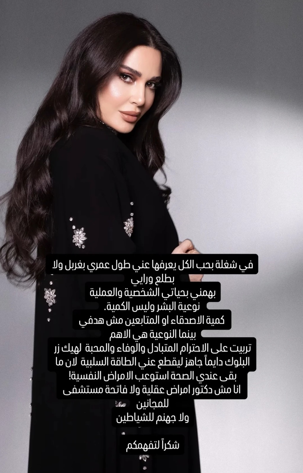 وجاء ردّها عبر خاصية “الستوريز” على إنستغرام، حيث شددت على أنها لا تنشغل بالكمّ بل بالنوعية، سواء في حياتها الشخصية أو العملية، مؤكدة أنها تفضّل إحاطة نفسها بالأشخاص الإيجابيين فقط.