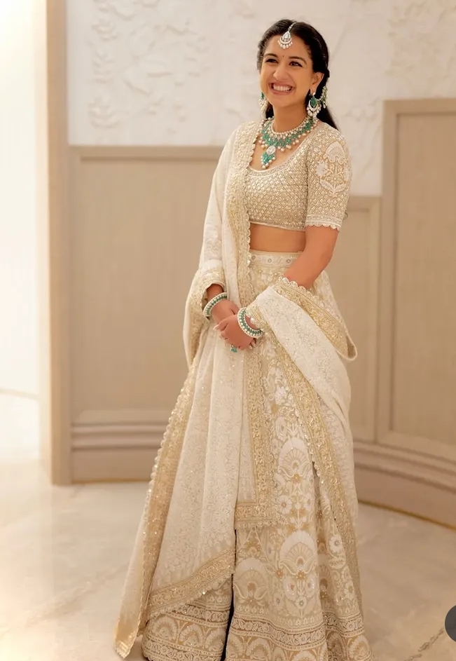 في ليلة العمر، تألقت بإطلالة تقليدية مستوحاة من الثقافة الغوجاراتية، جمعت بين الأبيض والأحمر مع تطريزات ذهبية فاخرة، وزيّنتها ورود حمراء متناثرة، فيما أضفى الذيل الطويل والوشاح الشفاف هالة ملكية على حضورها، لتُكمل المشهد بمجوهرات تراثية من إرث عائلتها.