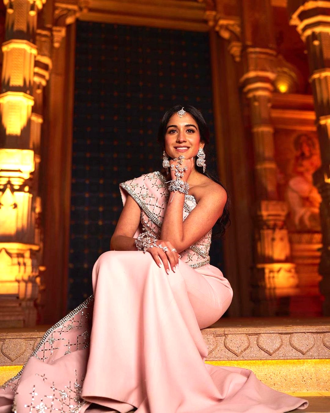 كما لفتت الأنظار بإطلالة حالمة بتوقيع Mohammed Ashi، حيث ارتدت تصميمًا مستوحى من الساري بلون وردي ناعم، بقصّة “وان شولدر” وتطريزات لامعة تناغمت مع مجوهراتها الماسية، في واحدة من أكثر إطلالاتها رومانسية.
