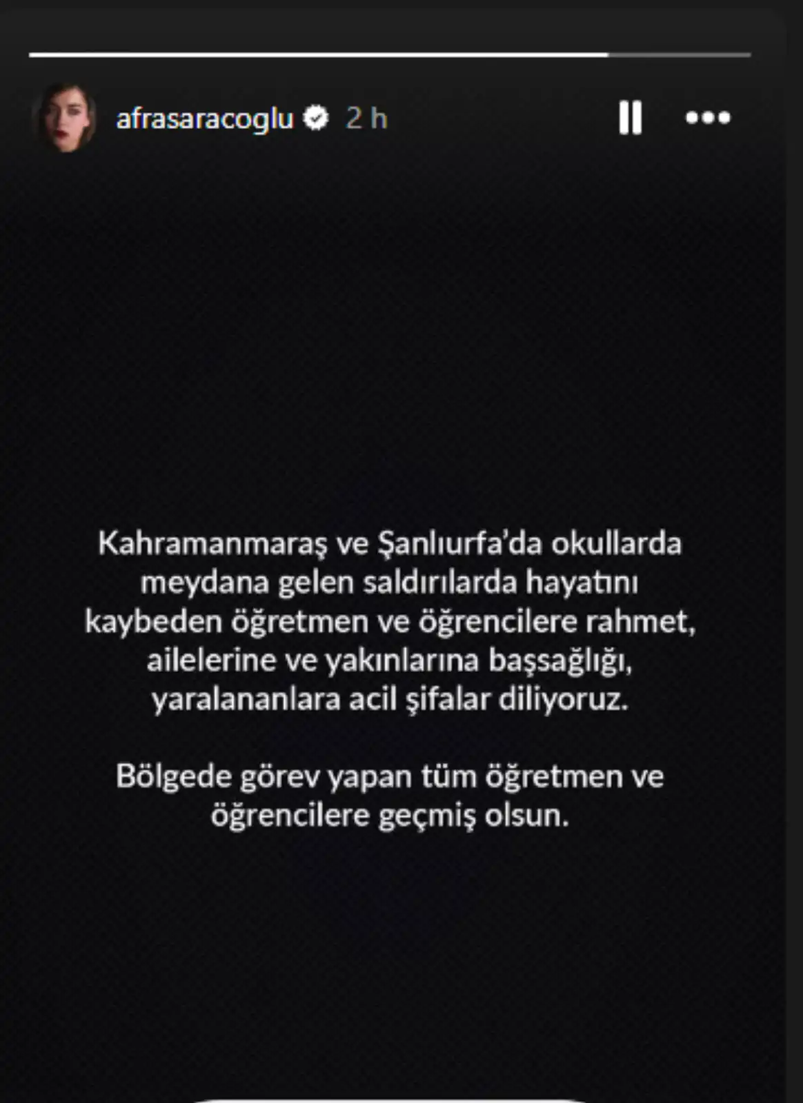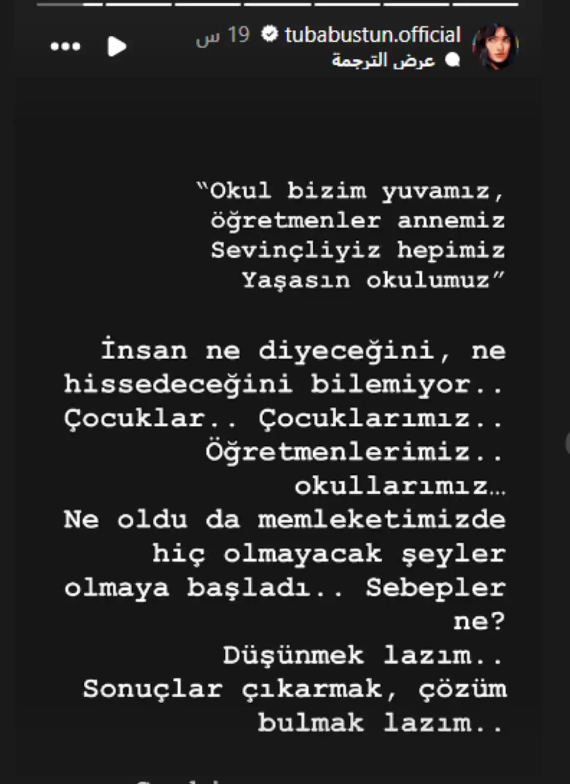نشرت بطلة مسلسل "العائلة هي الامتحان" رسالة تعزية عبر "إنستغرام"، ترحمت فيها على المعلمين والطلاب الذين فقدوا حياتهم في كهرمان مرعش وشانلي أورفا، متمنية السلامة والشفاء العاجل للمصابين ولجميع الكوادر التعليمية في المنطقة.
