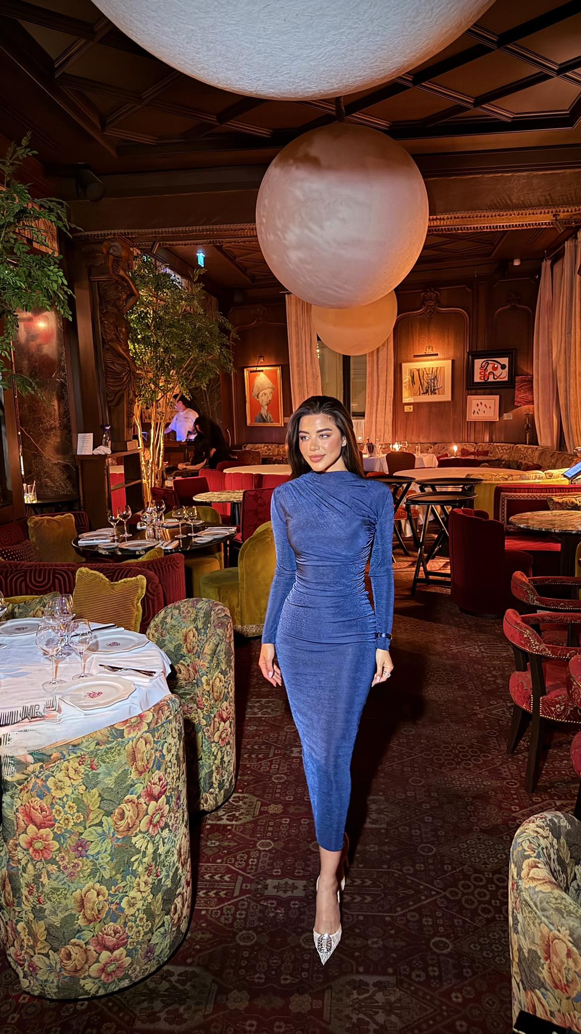 بفستان نيلي ينساب على القوام بقصة ميدي وأكمام طويلة، اختارت يارا أن تترك للخطوط مهمة التعبير. التصميم يبرز رشاقتها دون مبالغة، بينما أضاف الحذاء الفضي لمسة ضوء ناعمة.