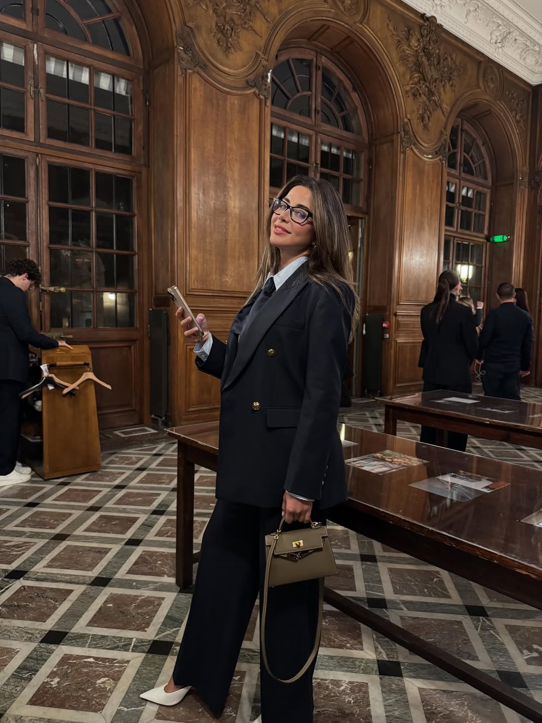 في إطلالة أخرى، ارتدت بدلة سوداء أنيقة من Sandro، بتصميم يجمع بين الخطوط الواسعة والأزرار الذهبية.