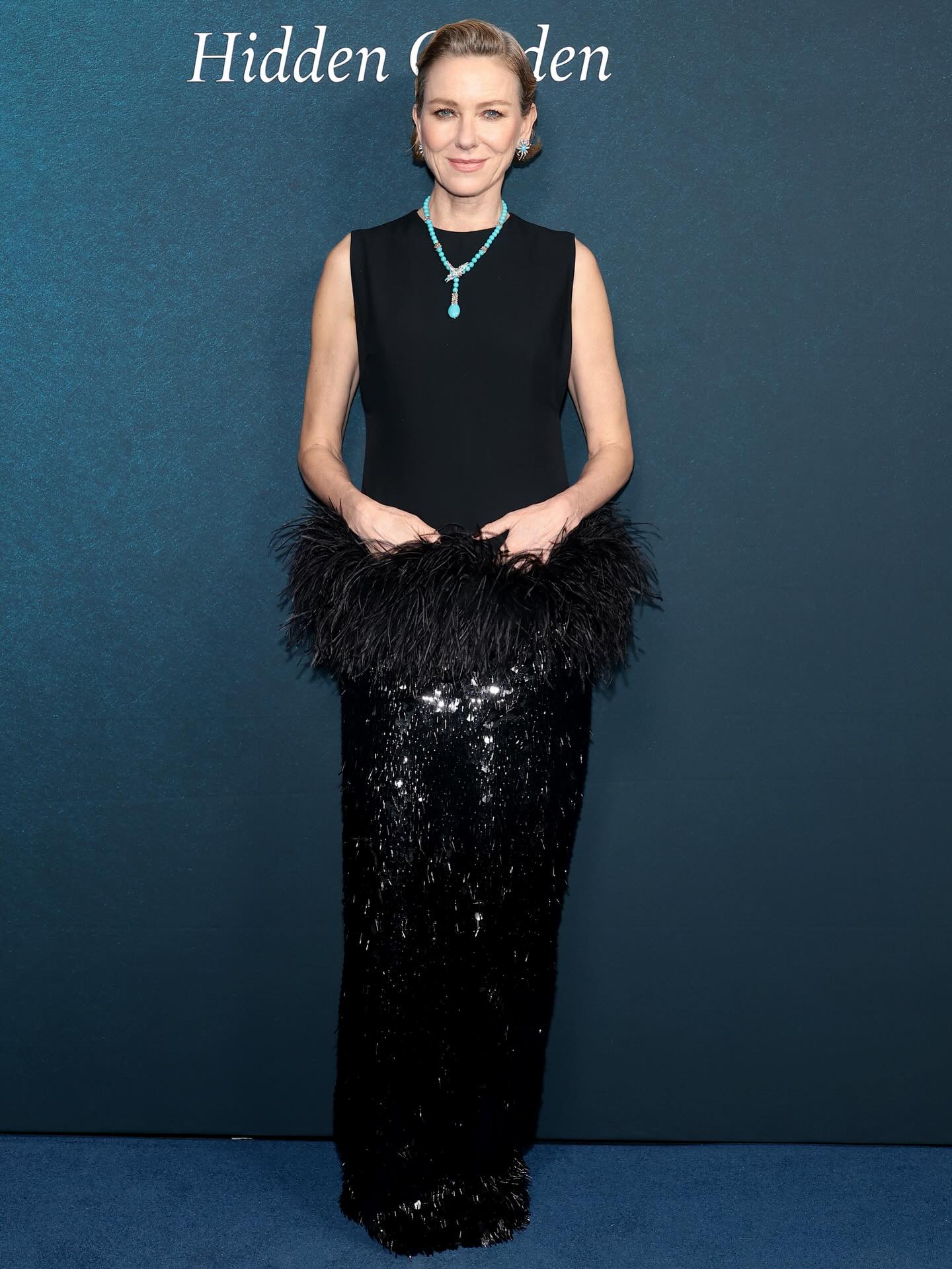 ناعومي واتس Naomi Watts اختارت فستانًا أسود من Taller Marmo، زيّنته تطريزات لامعة وريش عند الخصر.