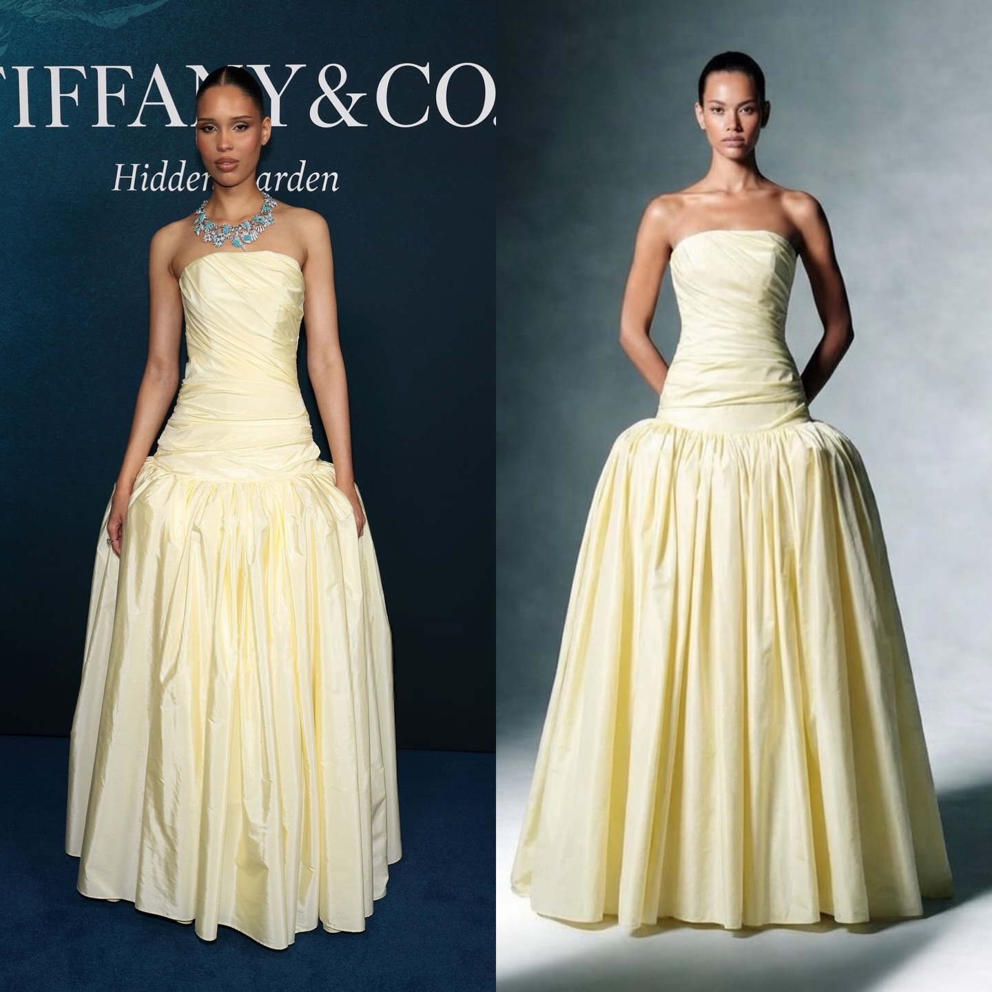 فستان بلا حمّالات، خصر منحوت، وتنورة منفوخة بتفاصيل دقيقة.