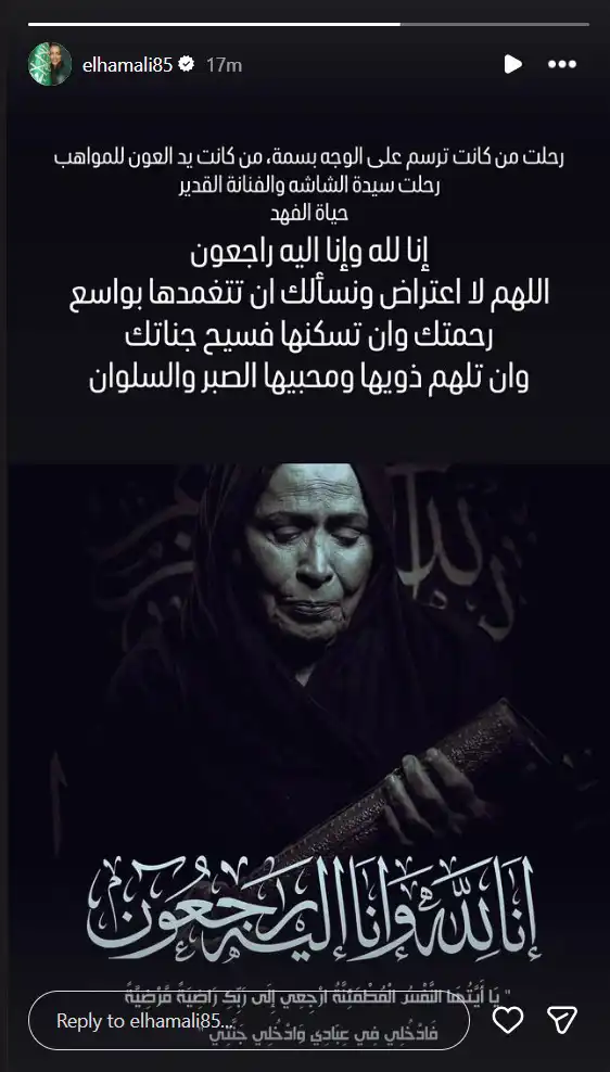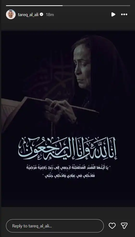 ودّع الفنان طارق العلي الفنانة القديرة حياة الفهد عبر خاصية "الستوري" في حسابه على "إنستغرام"، حيث شارك صورتها مرفقةً بآية من القرآن الكريم "يا أيتها النفس المطمئنة ارجعي إلى ربك راضيةً مرضية، فادخلي في عبادي وادخلي جنتي".