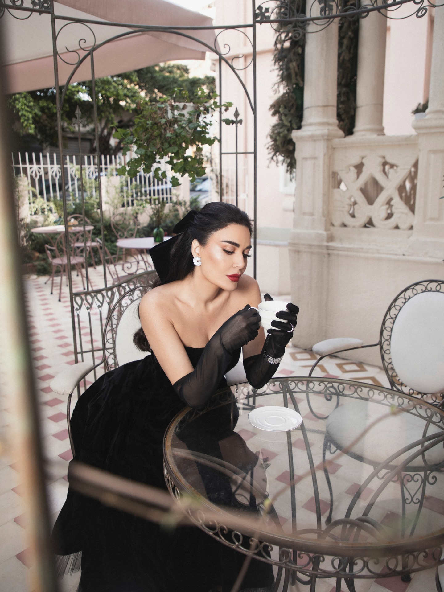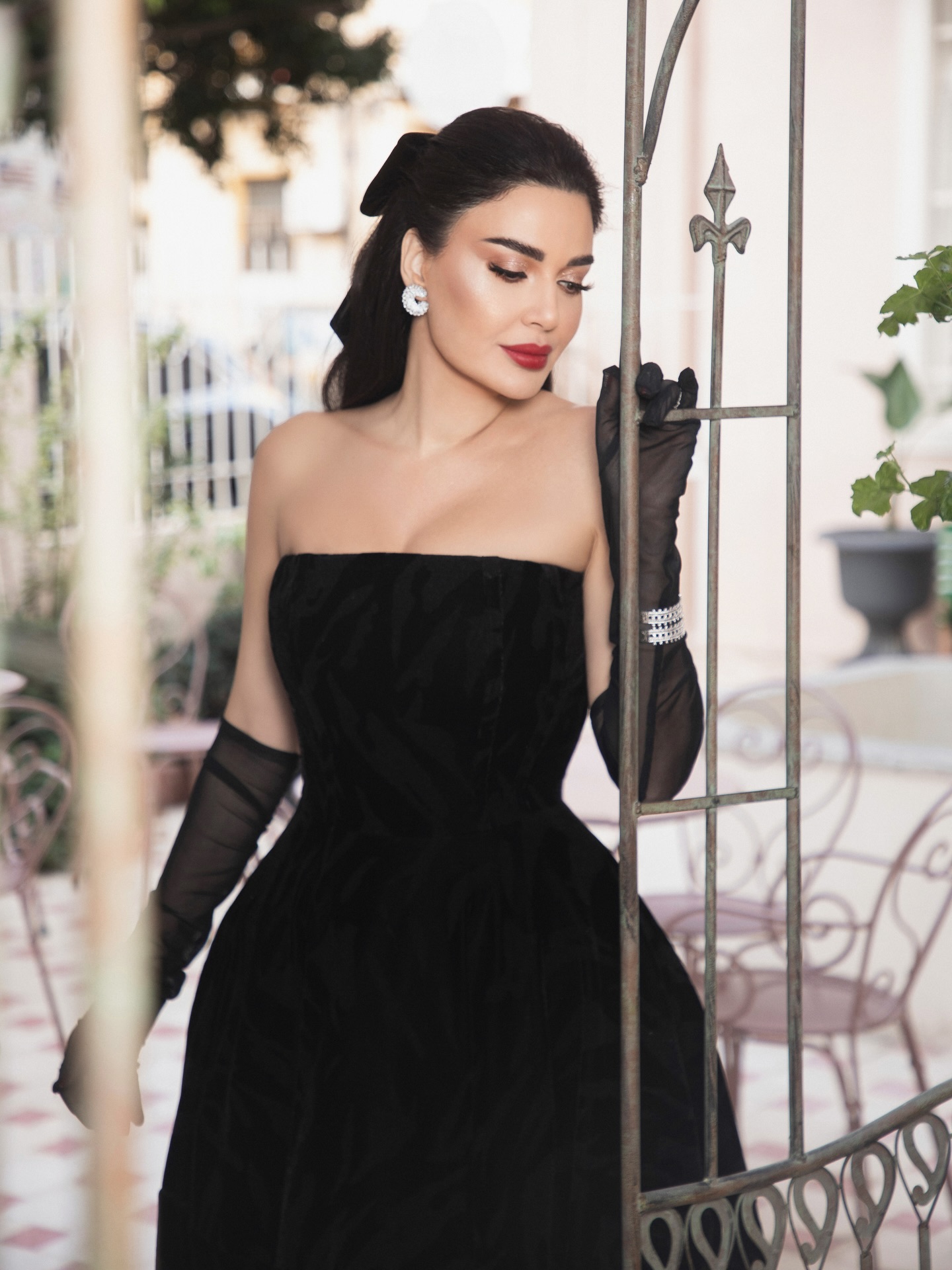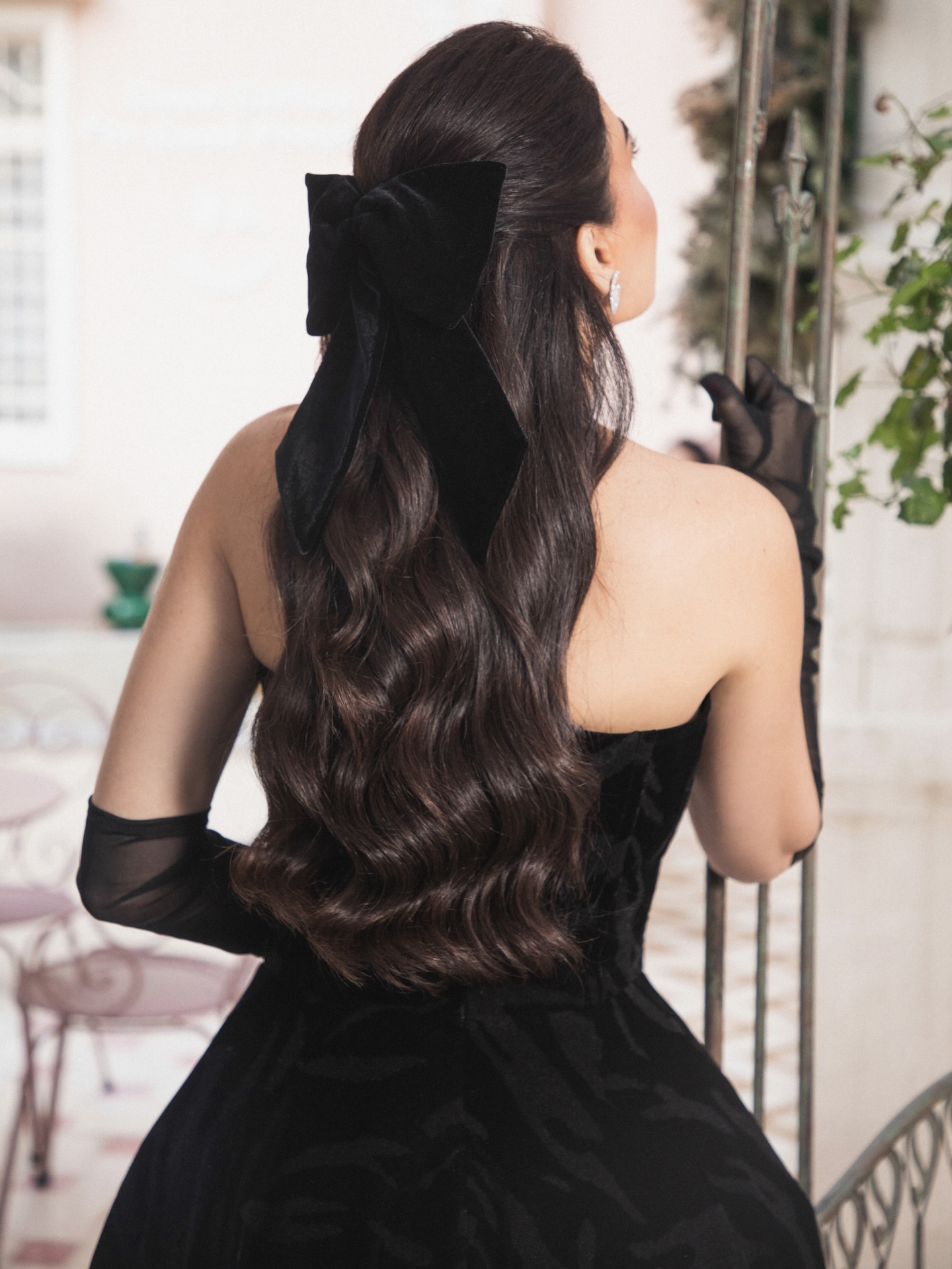 وفي الخلف، أطلّت فيونكة مخملية كبيرة تزيّن الشعر، في إشارة واضحة إلى عودة أسلوب الـ Coquette ولكن بنضج أكثر هدوءًا. أما المجوهرات، فجاءت ماسية لامعة، ونسّقت فوق القفازات بأسلوب جريء يعكس ثقة في اختيار التفاصيل.