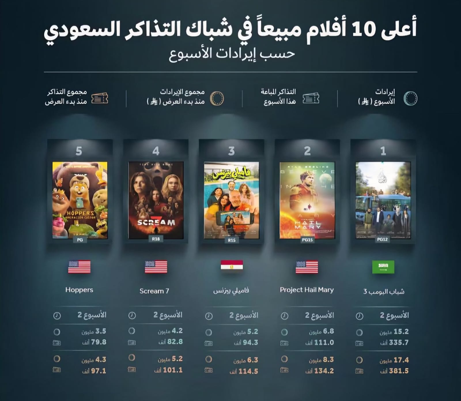 للأسبوع الخامس على التوالي يواصل فيلم “شباب البومب 3” تعزيز حضوره القوي في شباك التذاكر السعودي ، محافظاً على موقعه ضمن قائمة الأفلام الأعلى إيراداً، في سوق سينمائي يشهد منافسة محتدمة مع عرض نحو 46 فيلماً من مختلف الأنواع، بينها أعمال عالمية ضخمة الإنتاج.