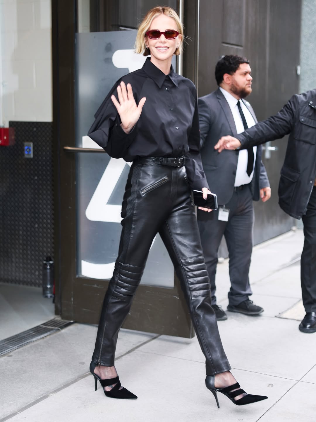 انتقلت شارليز إلى "النمط الروك" والشيك بذكاء مع دار Givenchy. ارتدت قميصاً أسود حريرياً منسقاً مع بنطال من الجلد الأسود اللامع بتصميم (Biker Pants) بلمسات عصرية عند الركبة. هذه الإطلالة تعكس روح القوة والمواجهة التي تظهر في فيلمها الجديد، حيث تتخلى عن النعومة لتظهر في قمة جبروتها كفنانة تتقن كل الأدوار، مدعومة بنظارات شمسية برغندية أضافت لمسة من الغموض.