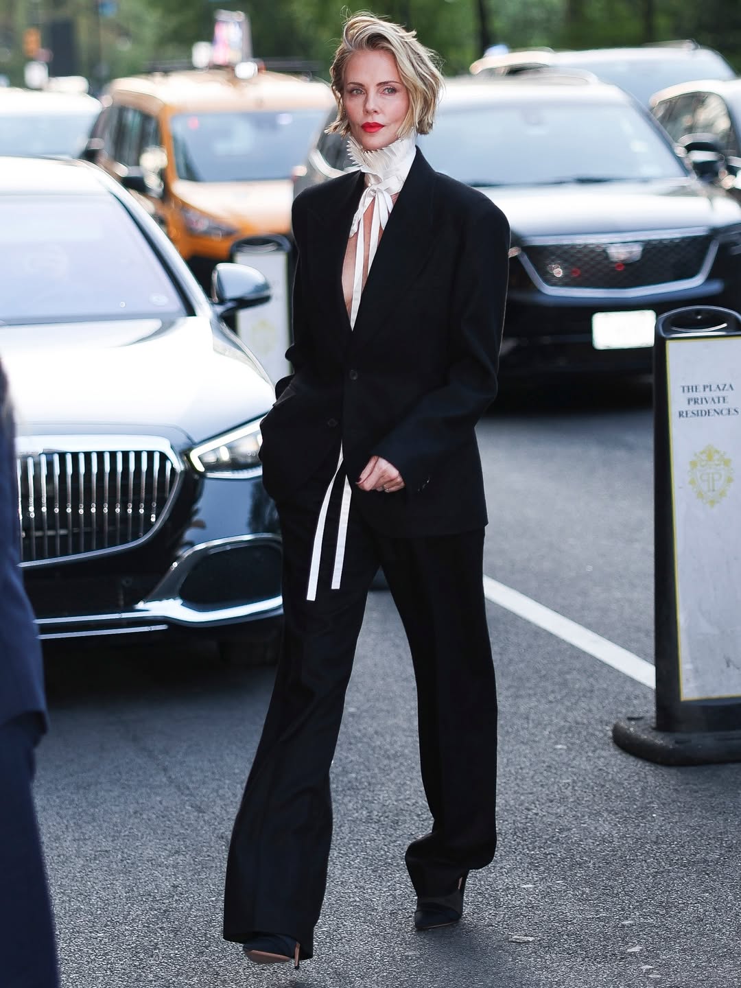 في هذه الإطلالة، تجسد شارليز مفهوم "القوة الناعمة". ارتدت طقماً أسود من دار Dior، تميز ببنطال واسع وسترة (Blazer) بفتحة صدر جريئة، لكن اللمسة العبقرية كانت في "الوشاح" الأبيض الملتف حول الرقبة بأسلوب يحاكي ياقات العصر الفيكتوري، مع شرائط منسدلة من الحرير الأبيض. هذا التباين بين الأبيض والأسود يعكس التوازن بين صرامة العمل الفني ورقّة الروح. بين جرأة ظهور الجسد وبين البذلة الرجالية.