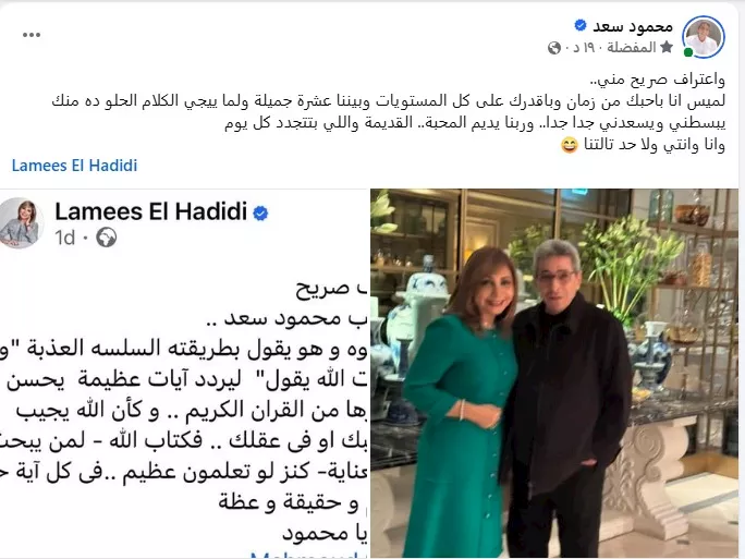 وأكد سعد في منشوره أن محبته للميس الحديدي تمتد لسنوات طويلة، مشدداً على تقديره لها على كافة المستويات المهنية والإنسانية. وعبّر عن سعادته البالغة حين يأتي الكلام الجميل من شخصية بقيمتها، واصفاً العلاقة بينهما بالعشرة الجميلة التي تتجدد يوماً بعد يوم، معقباً بقوله وأنا وأنتِ ولا حد تالتنا في إشارة إلى عمق الصداقة التي لا تشوبها شائبة.