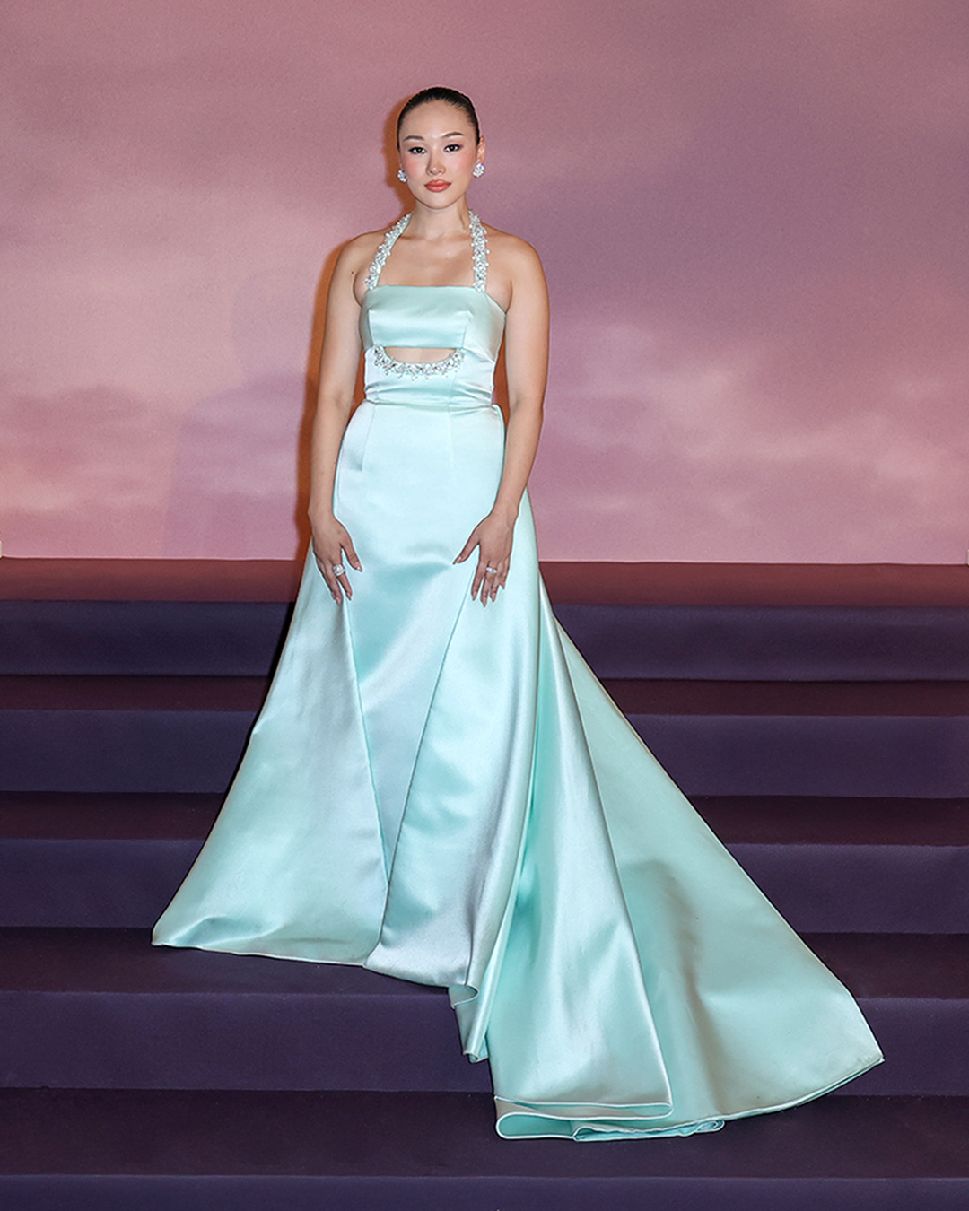 النجمة الشابة Sadie Sink، سفيرة الدار، تألّقت بثوب حريري أخضر شاحب، بقصّة سترابلس مع كورسيه مكشوف الظهر وتنورة منتفخة بأسلوب ملكي. أضفت مجوهرات Bvlgari لمسة من الفخامة الهادئة على الإطلالة.