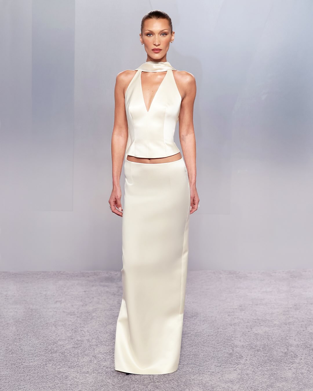 العارضة Bella Hadid اختارت طقمًا حريريًا عاجيًا من Prada، مؤلفًا من تنورة بنسل منخفضة الخصر وتوب بفتحة هالتر عميقة مع وشاح خلفي. بساطة التصميم ترافقت مع دقة في التفاصيل، أبرزتها تسريحة الكعكة والمجوهرات الماسية.