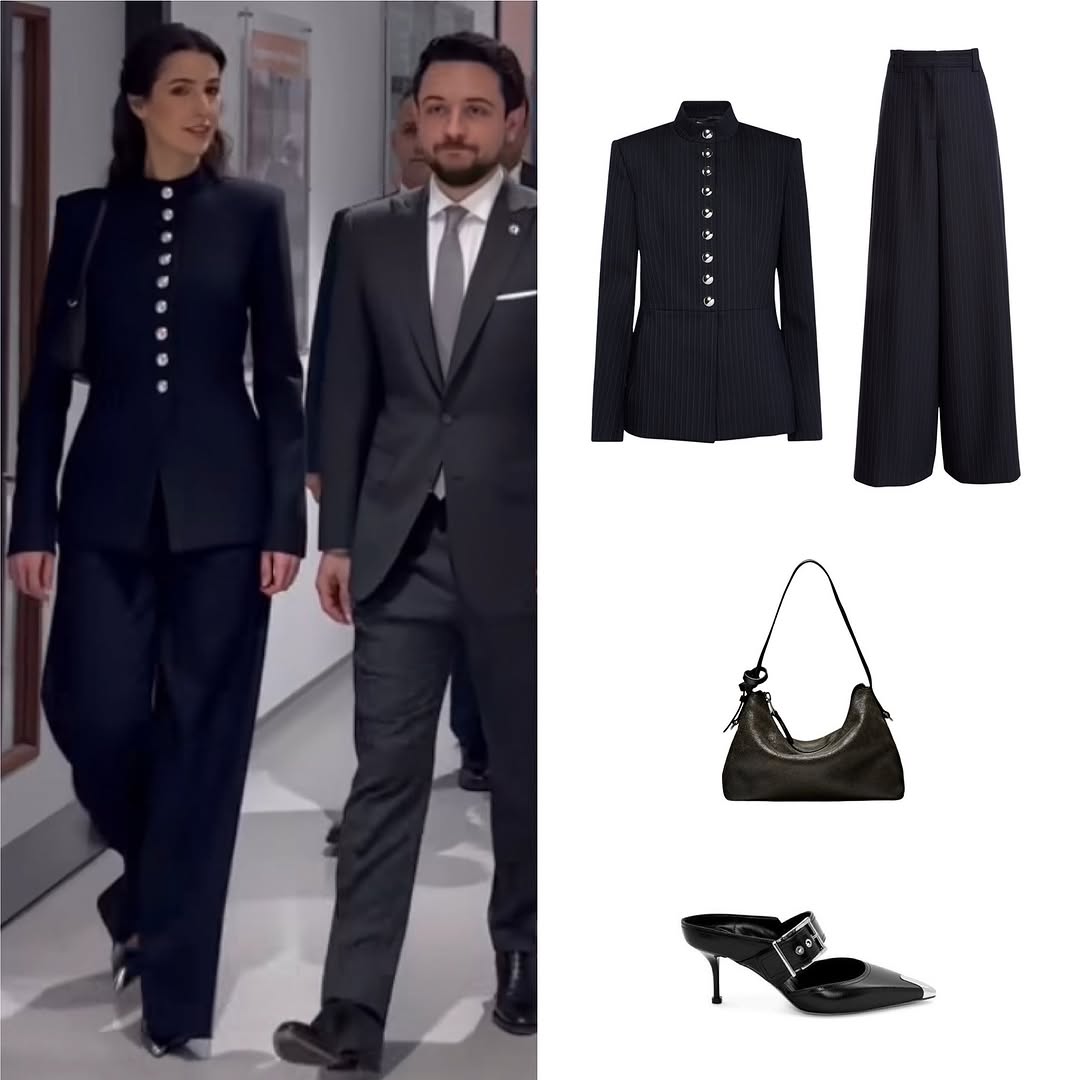خلال زيارة رسمية إلى لندن، اختارت الأميرة طقماً من Khaite، مؤلفاً من سترة مخططة وسروال واسع الساقين، في انسجام بين الكلاسيكية والراحة العصرية. وأكملت إطلالتها بحقيبة سوداء من Massimo Dutti، وحذاء بتفصيل جريء من Alexander McQueen، لتؤكد أن البساطة لا تعني الغياب، بل حضوراً محسوباً بدقة.