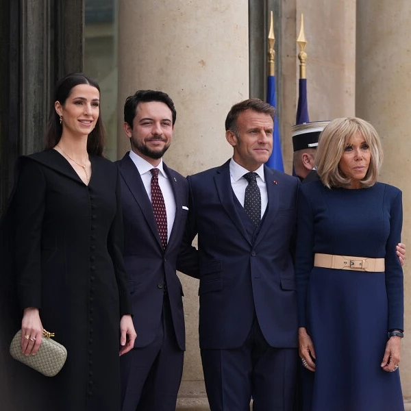 خلال لقائها مع إيمانويل ماكرون وزوجته بريجيت ماكرون في قصر الإليزيه، تألقت الأميرة بفستان من الكريب بتصميم محتشم وياقة على شكل V مع كاب طويل. التصميم، الذي حمل توقيع منى الشبل، عكس مزيجاً بين الكلاسيكية والأنوثة الملكية. واختارت له حقيبة من Bottega Veneta، بلون هادئ وتقنية نسج فاخرة، لتكتمل صورة الأناقة العربية المعاصرة.