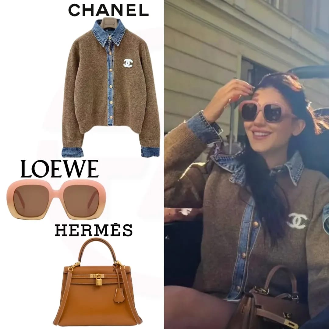 القطعة المركزية في هذه الإطلالة هي سترة (Cardigan) من دار Chanel، والتي تأتي بتصميم مبتكر يدمج بين الصوف البني الناعم وتفاصيل "الدنيم" (الجينز) عند الياقة، الأطراف، وخط الأزرار. هذا الدمج يمنح القطعة طابعاً حيوياً يكسر جمود الصوف التقليدي، مع الحفاظ على بصمة الدار العريقة من خلال شعار "CC" المزدوج الذي يزين الصدر، مما يجعلها قطعة استثمارية مثالية تجمع بين الدفء والأناقة.