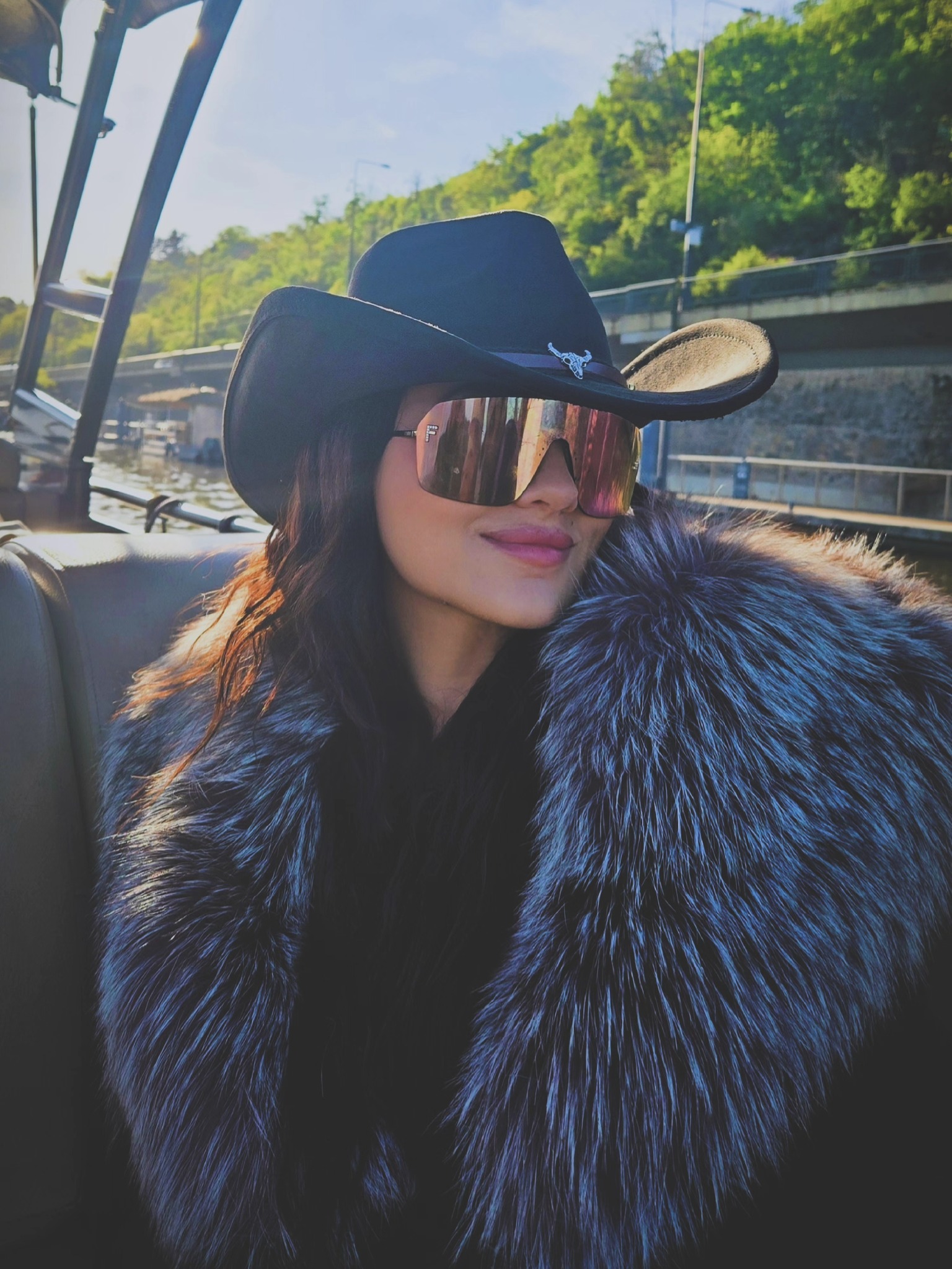 أما اللمسة التي جعلت هذه الإطلالة مميزة ، فهي اختيارها لقبعة "الكاو بوي" السوداء التي توجت بها رأسها، مانحةً إياها طابعاً غامضاً ومغامراً يتناسب تماماً مع أجواء الرحلة البحرية. ولم تكتمل الإطلالة إلا بنظارات شمسية عاكسة ضخمة غطت ملامحها بنعومة، مما أضفى طابعاً مستقبلياً يمتزج بروح الغرب الأمريكي القديم.