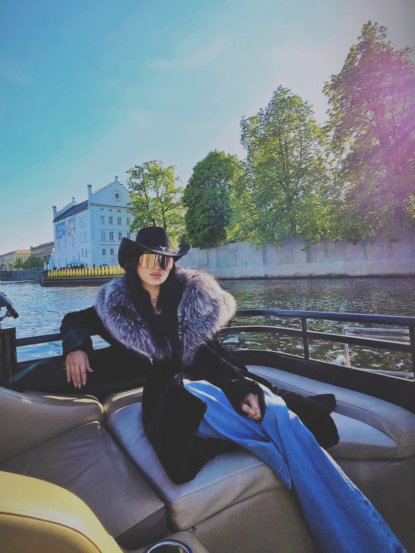 بإطلالة دراماتيكية ساحرة، استقلت مي عمر القارب لتجوب أنهار براغ، معتمدةً معطفاً طويلاً باللون الأسود الفاخر، يتميز بياقة ضخمة من الفرو الرمادي الكثيف، مما أضفى لمسة من الأرستقراطية والدفء على مظهرها وسط الأجواء المشمسة والباردة في آن واحد. ولتكسر حدة الفخامة بلمسة عصرية، نسقت المعطف مع بنطال جينز أزرق بقصة واسعة، في خطوة تعكس ذكاءها في دمج القطع "الكاجوال" مع الملابس الراقية لخلق توازن بصري مريح وجذاب.