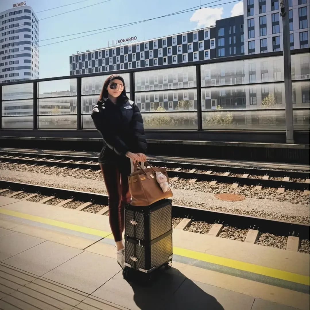 حقيبة Birkin من Hermès: باللون العسلي (Tan)، والتي وضعتها فوق حقيبة السفر، لتكسر حدة الألوان الداكنة وتضيف لمسة "كلاسيكية" فورية.