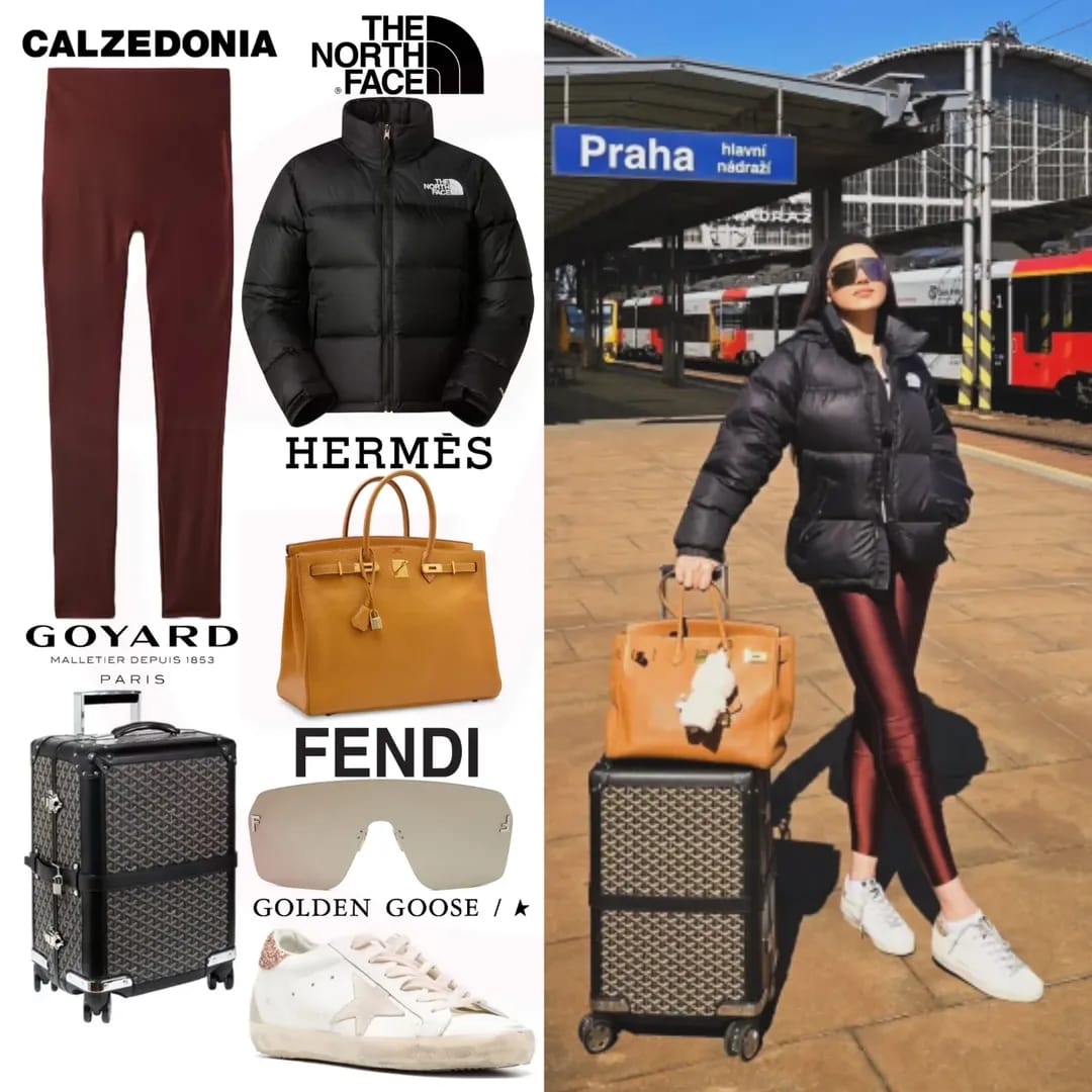 اعتمدت مي على "ليغينز" (Leggings) باللون العنابي اللامع من علامة Calzedonia، مما أضفى لمسة حيوية على اللون الأسود السائد في الجاكيت المنفوخ من The North Face. هذا المزيج بين الخامة الرياضية والجلد اللامع يخلق توازناً بصرياً جذاباً يناسب أجواء السفر الباردة.